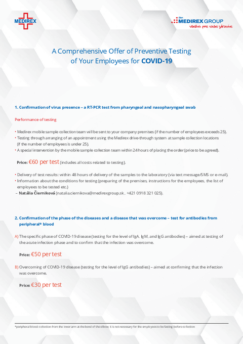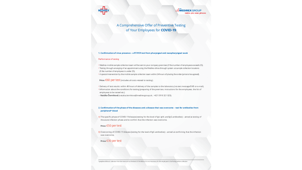 En cas d'intérêt ou pour tout complément d´information, n'hésitez pas à nous contacter, ou directement M. Rušin, directeur commercial de la société Medirex : (+421 911 856 052), daniel.rusin(@)medirexgroup.sk