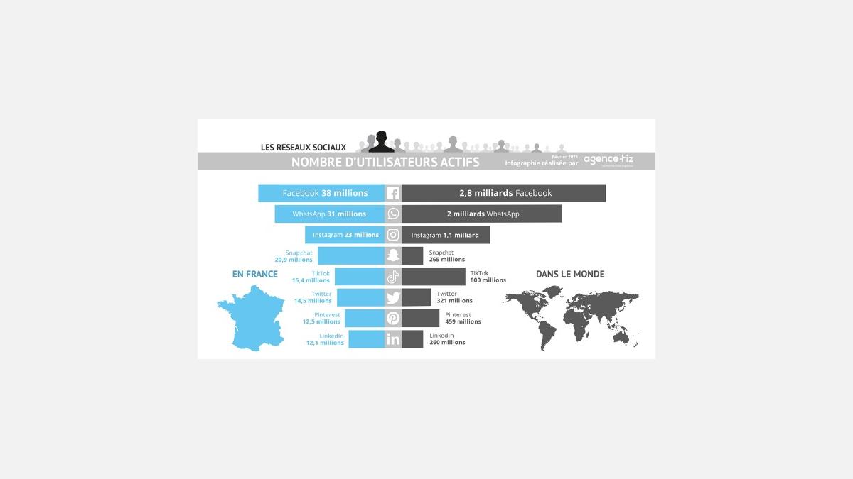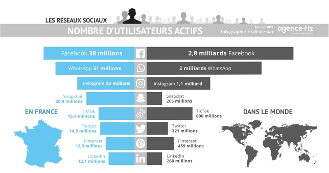 A ce titre, il est intéressant de comparer la place des réseaux sociaux en France et dans le Monde, grâce à cette infographie communiquée par ©Agence Tiz, site www.tiz.fr. Source http://www.alexitauzin.com/2013/04/combien-dutilisateurs-de-facebook.html