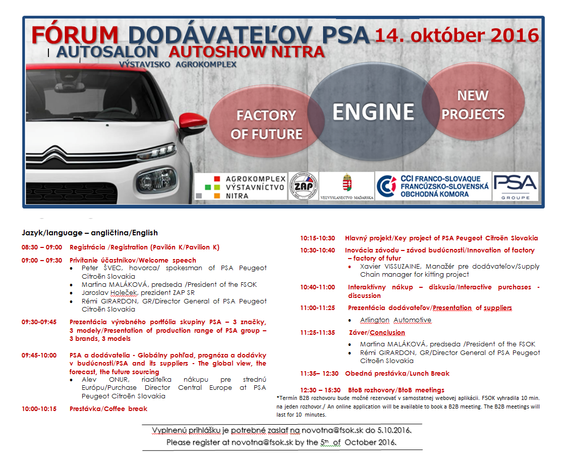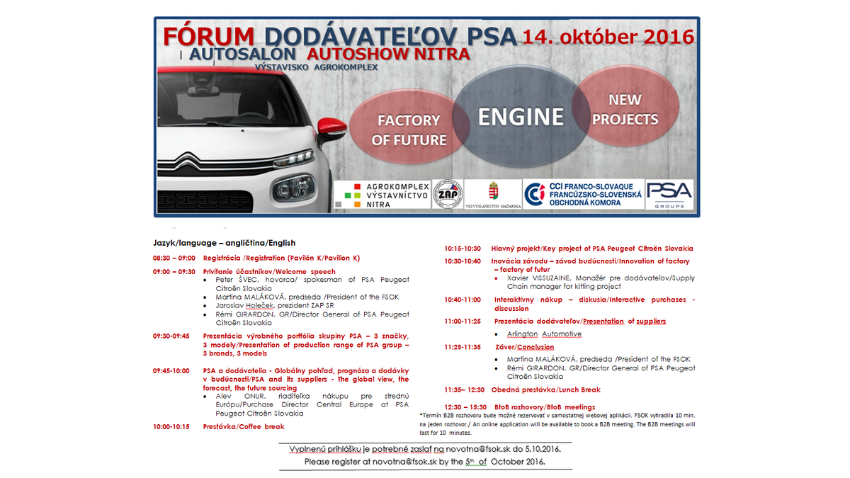 La deuxième édition du Forum des fournisseurs PSA s'est déroulée dans les locaux du parc des expositions Agrokomplex dans la ville de Nitra pendant le Salon de l'Automobile qui a eu lieu du 13 au 16 octobre 2016. Pendant le programme riche et varié dans la matinée les participants ont eu la possibilité d'apprendre davantage sur les projets clés, les visions stratégiques et les innovations d’usine de PSA Peugeot Citroën Slovakia. Ensuite les participants ont eu la possibilité de passer aux négociations commerciales pendant les rencontres B2B qui présentaient une opportunité unique de discuter sur la coopération potentielle avec les représentants de PSA ainsi qu’avec d’autres entreprises locales et étrangères.