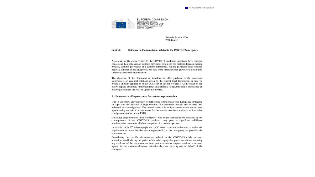La Commission européenne à mis à disposition un guide sur les questions douanières liées à l'urgence COVID-19 (application des dispositions douanières, procédures et formalités douanières).