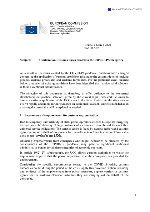 La Commission européenne à mis à disposition un guide sur les questions douanières liées à l'urgence COVID-19 (application des dispositions douanières, procédures et formalités douanières).