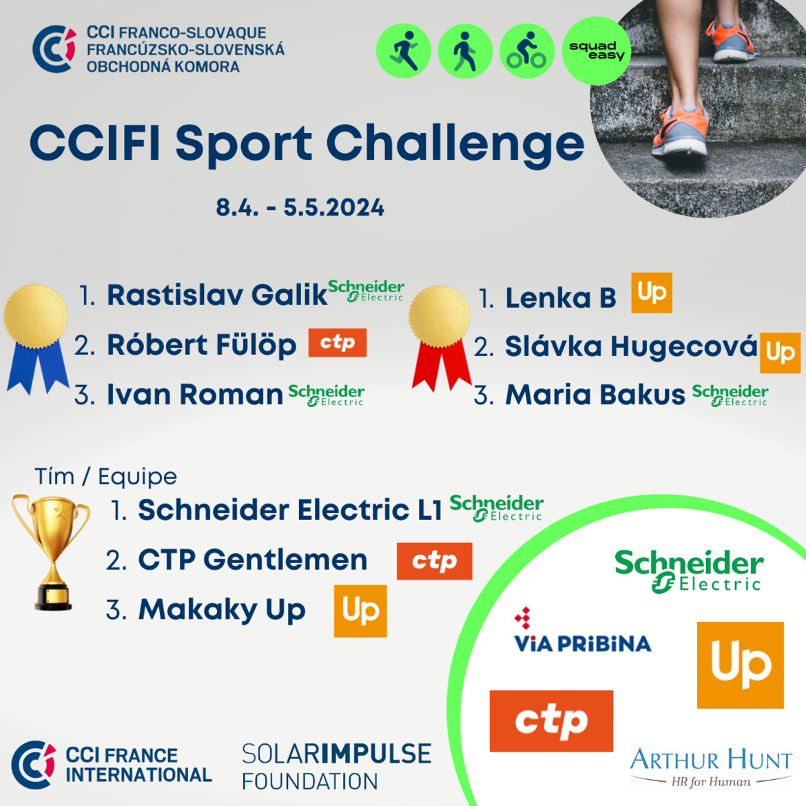 4 semaines de performances sportives ont pris fin dimanche dernier, le 5 mai, et nous sommes fiers que 12 équipes slovaques composées par nos sociétés membres aient contribué à l’objectif solidaire de soutien des solutions écologiques du partenaire du défi SolarImpulse et à notre engagement commun envers un avenir durable.