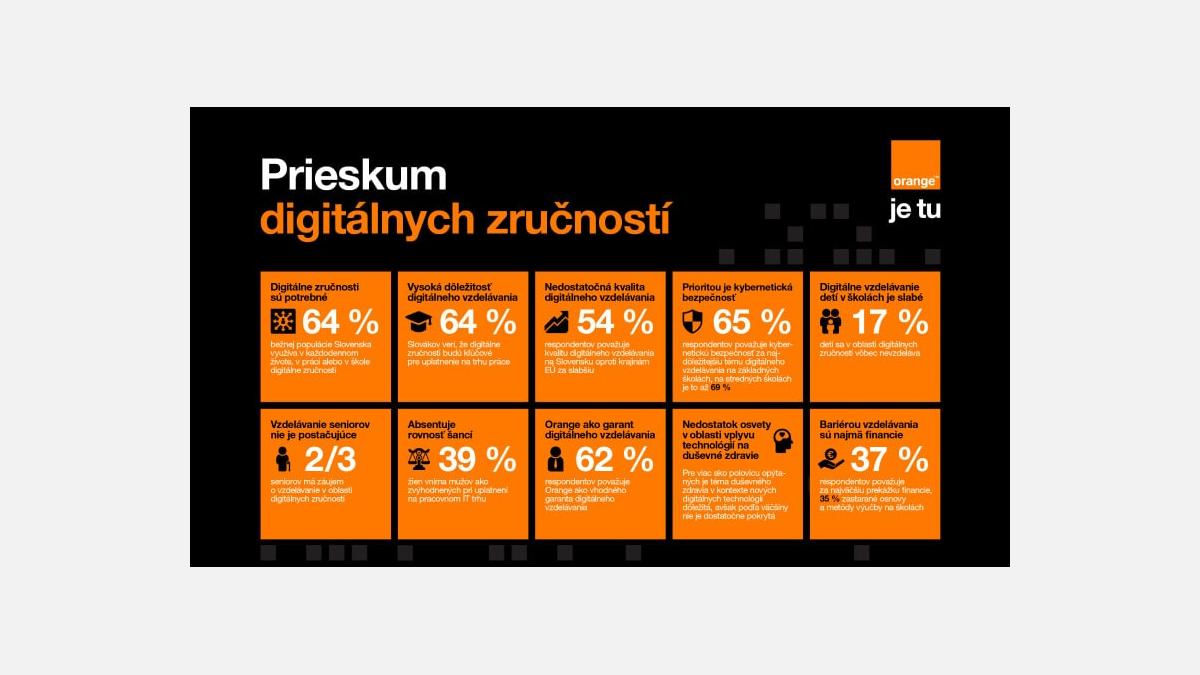 Les résultats d'une enquête récente, réalisée par l'agence de sondage Group M pour Orange, ont révélé plusieurs tendances clés. Jusqu'à 54 % des répondants estiment que la qualité de l'éducation dans le domaine des technologies numériques en Slovaquie est inférieure à celle des autres pays de l'UE. Les compétences numériques sont pourtant essentielles pour l'avenir – 64 % des Slovaques croient qu'elles deviendront de plus en plus importantes pour l'intégration sur le marché du travail. Près de deux tiers de la population slovaque utilisent les compétences numériques dans leur vie quotidienne, au travail ou à l'école. Ceux qui s'intéressent à l'éducation dans ce domaine rencontrent souvent des barrières financières ou un manque de programmes éducatifs de qualité. Jusqu'à 37 % des personnes interrogées ont déclaré ne pas disposer de ressources financières suffisantes pour se former, et 35 % considèrent que les programmes et méthodes d'enseignement des compétences numériques dans les écoles sont obsolètes.