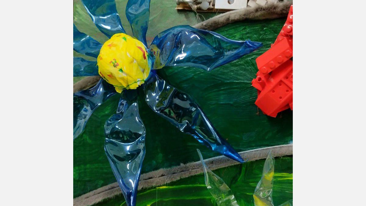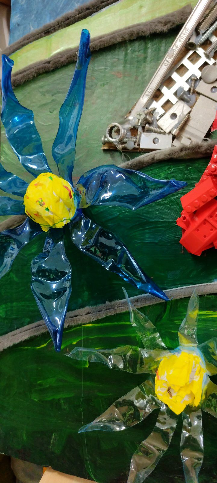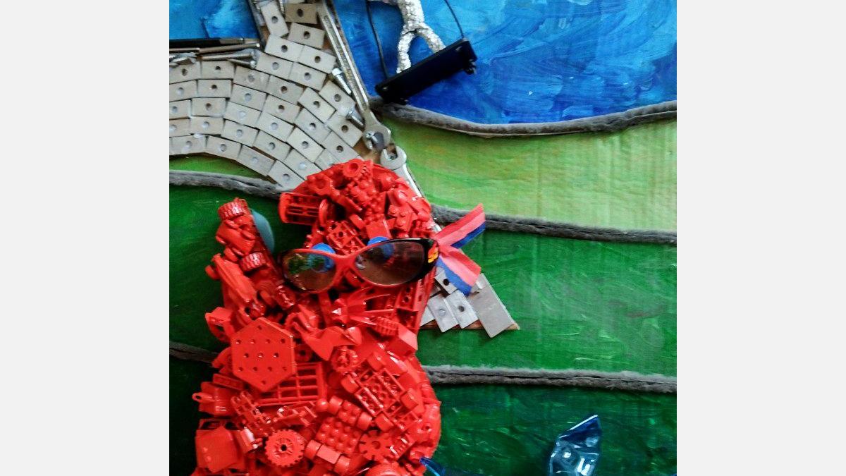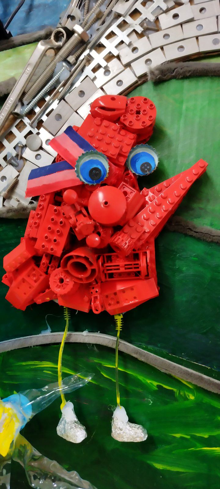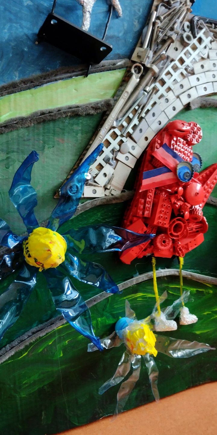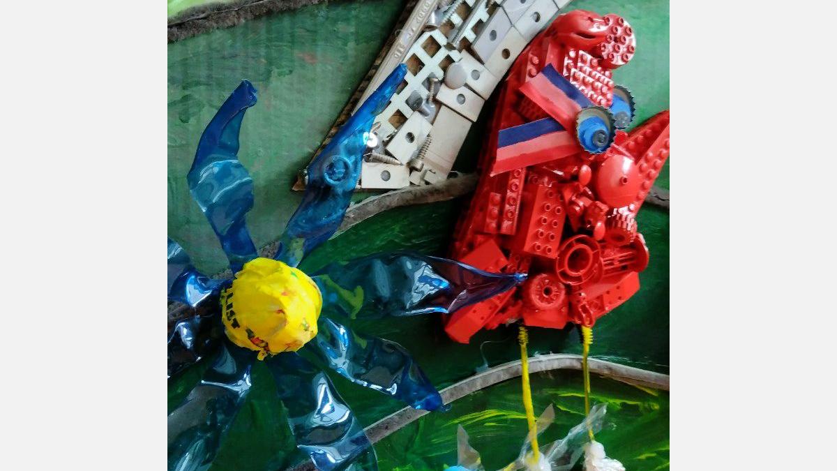 PLAST - stavebnica LEGO, plastové viečka z tubusov, CD nosiče, káble zo starých nabíjačiek, plastové doštičky, PET fľaše, gombíky
