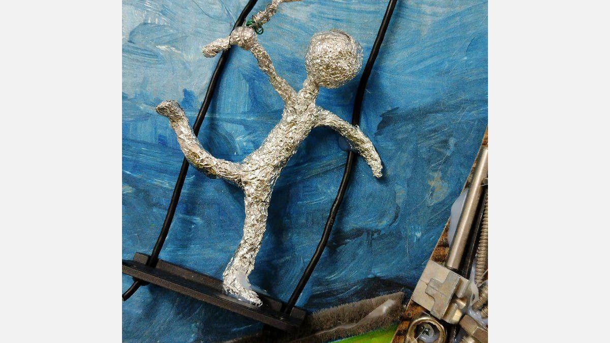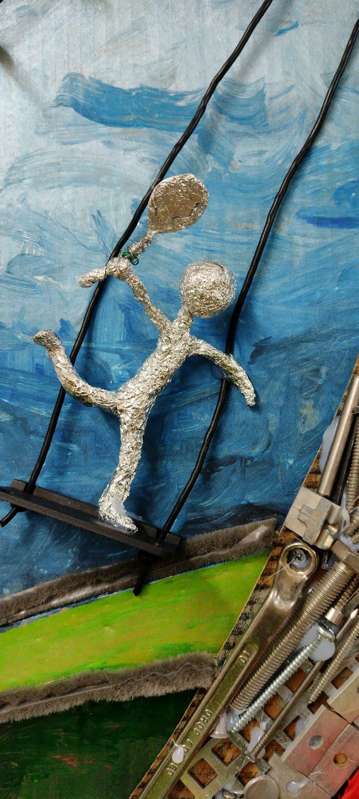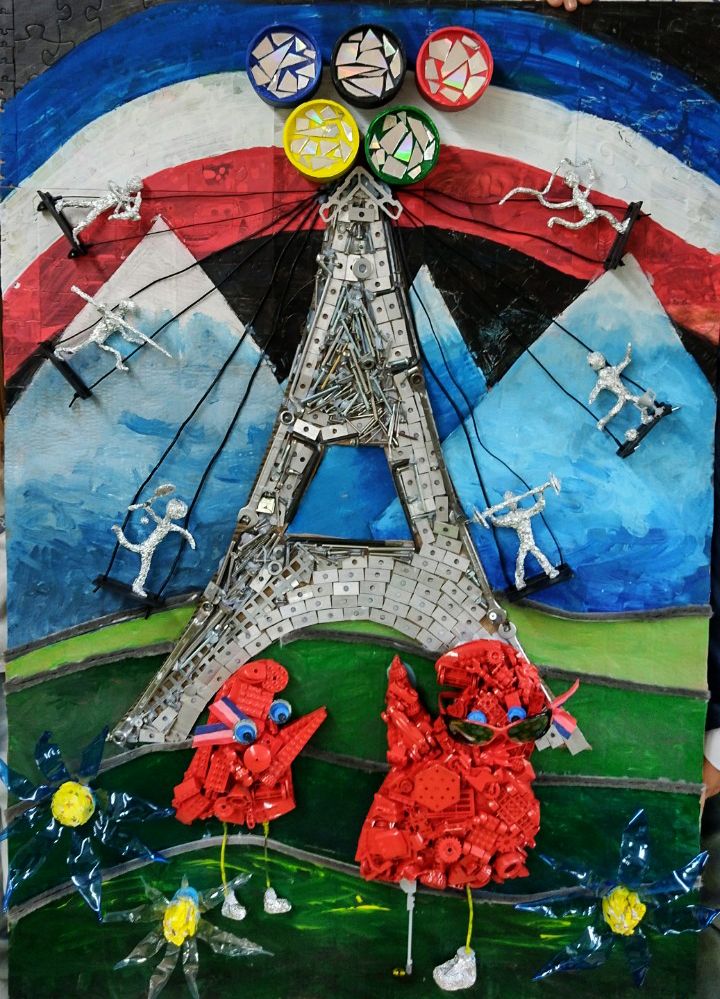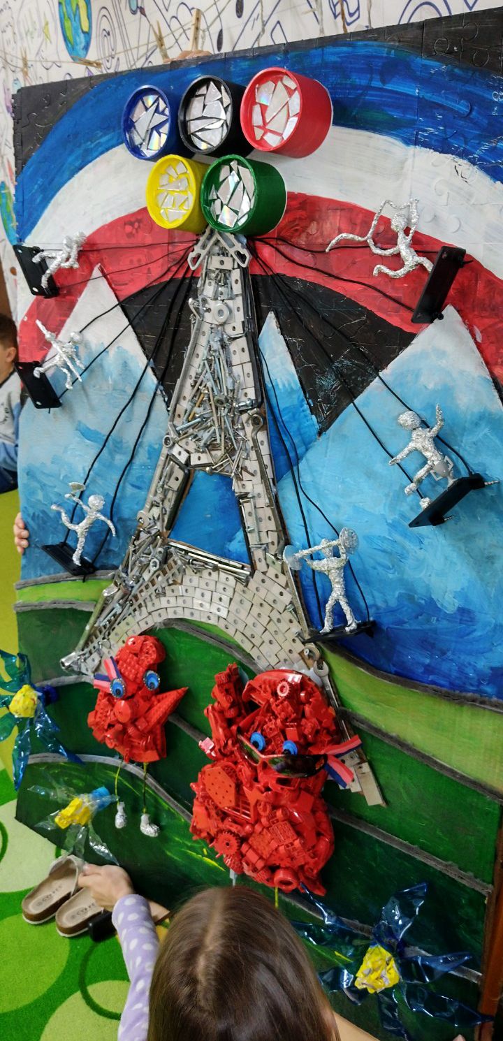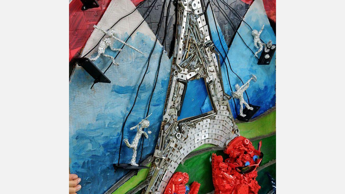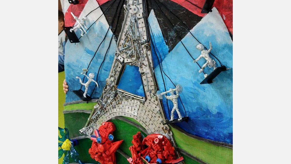 Ústredným motívom je replika EIFFELLOVEJ VEŽE z kovového materiálu, vyrobená z rôznych kovových kľúčov, zo spojovacieho materiálu a hliníkových doštičiek. EIFFELLOVÚ VEŽU sme vyobrazili ako retiazkový kolotoč s 3D postavami športovcov. Športovcov sme vyrobili z mäkkého drôtu a alobalu. Prichytili sme ich taviacou pištoľou na plastové doštičky a pripevnili ku veži káblami z nabíjačiek.