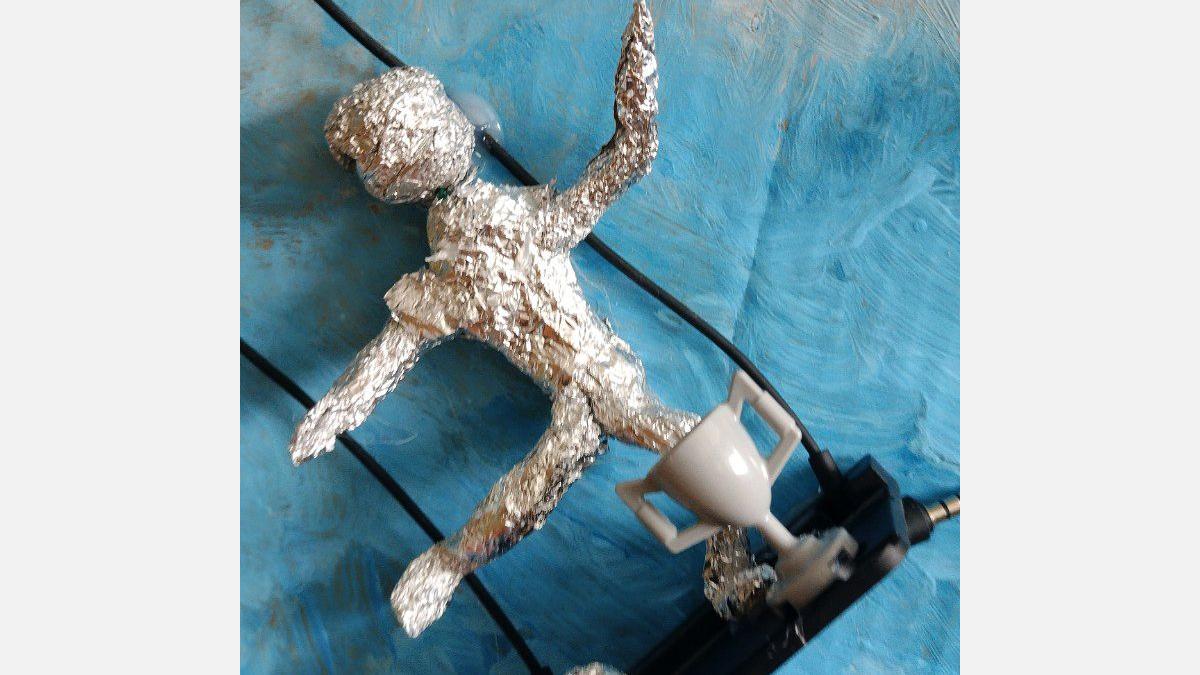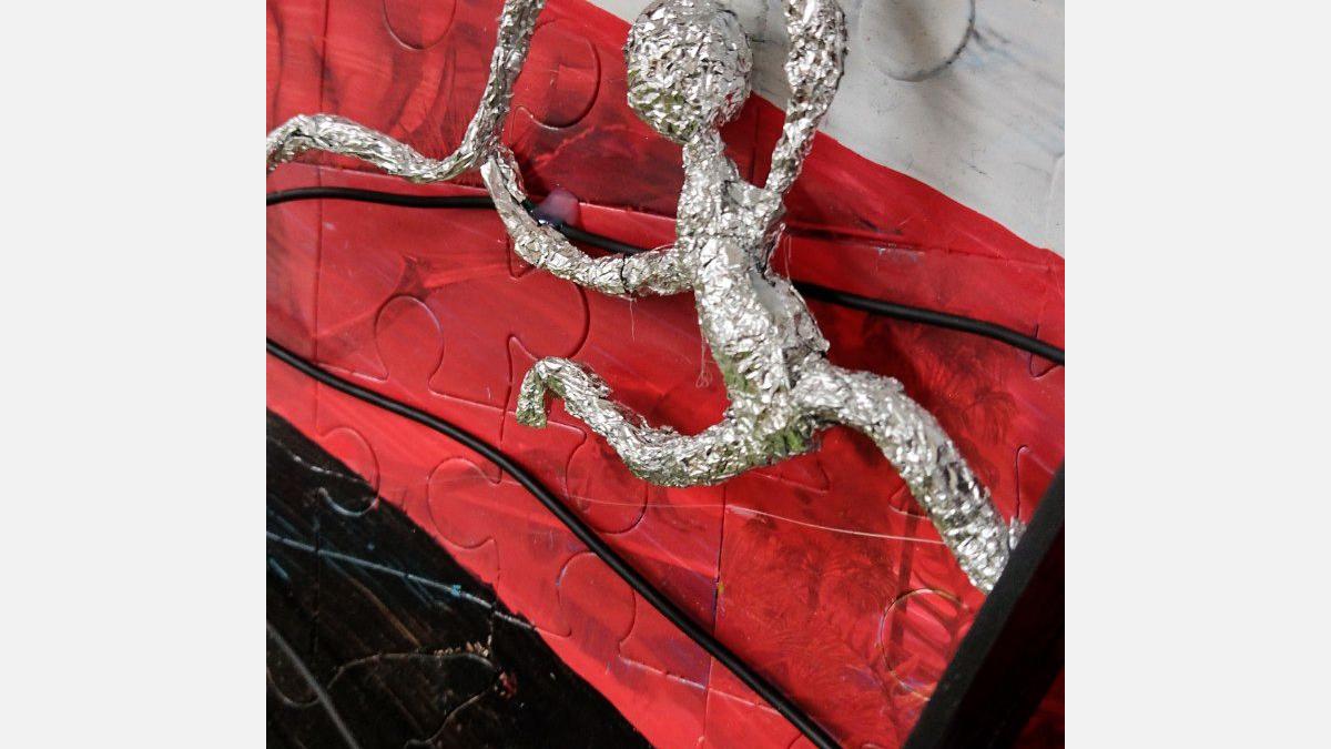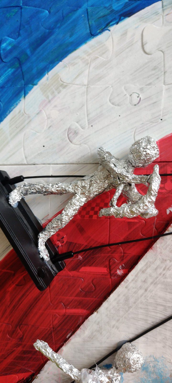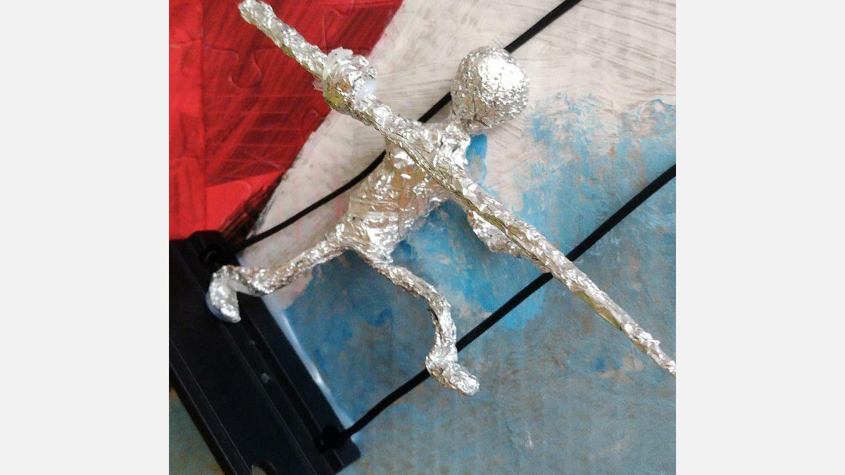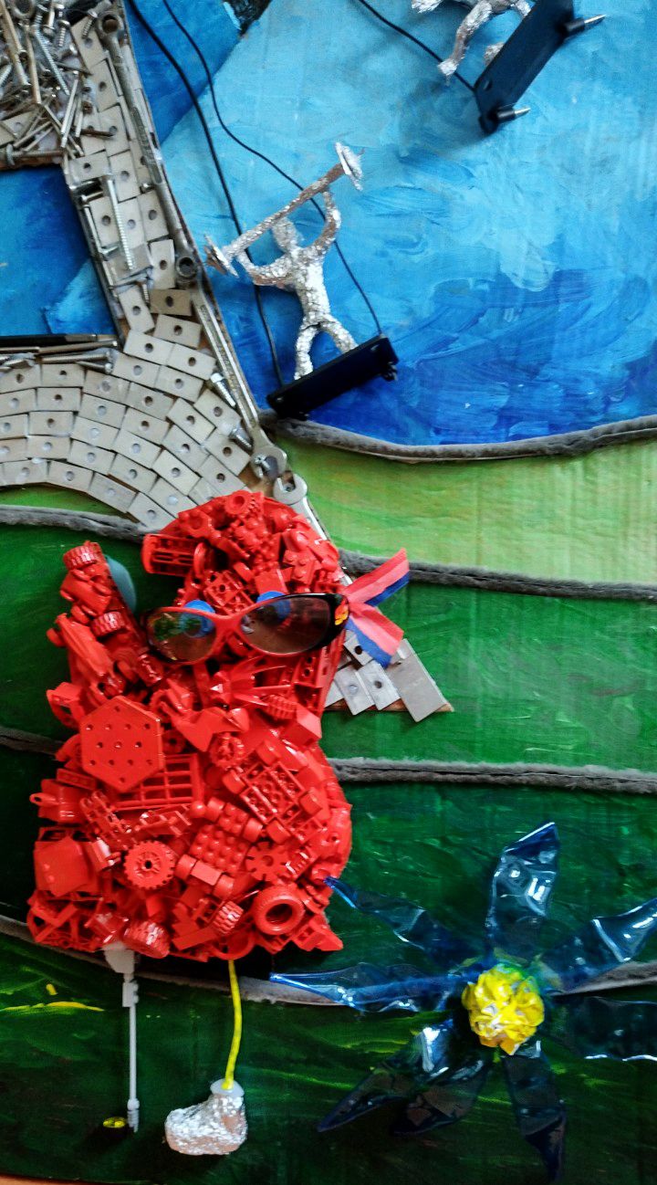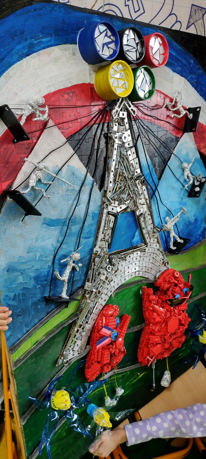 V spodnej časti diela pod vežou mávajú na športovcov fanúšikovia – maskoti OH Paríž 2024. Maskotov sme nakreslili na kartón, na ktorý sme postupne lepili taviacou pištoľou kocky z lega. Nohy sme vyrobili z káblov a alobalu, na protézu nohy sme využili plastovú časť z lega. Oči tvoria vrchnáky z piva + namaľovaný kartón a čierny gombík v strede. Stuha vo farbách francúzskej vlajky je vyfarbená fixkami.