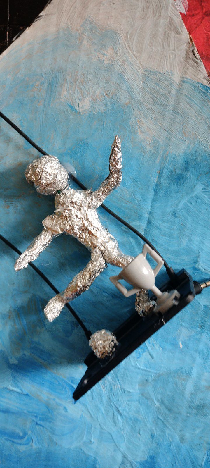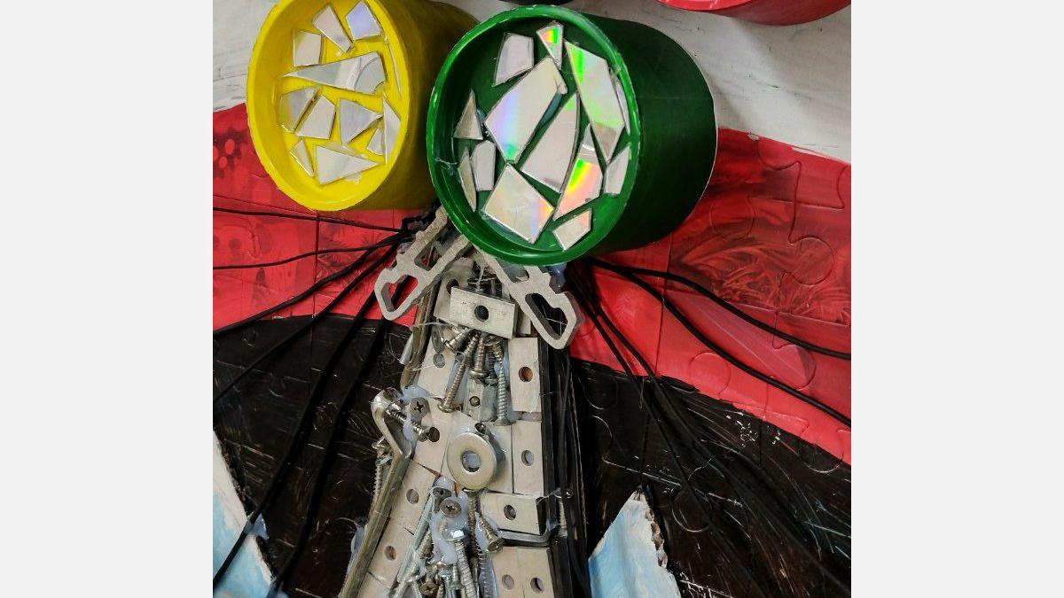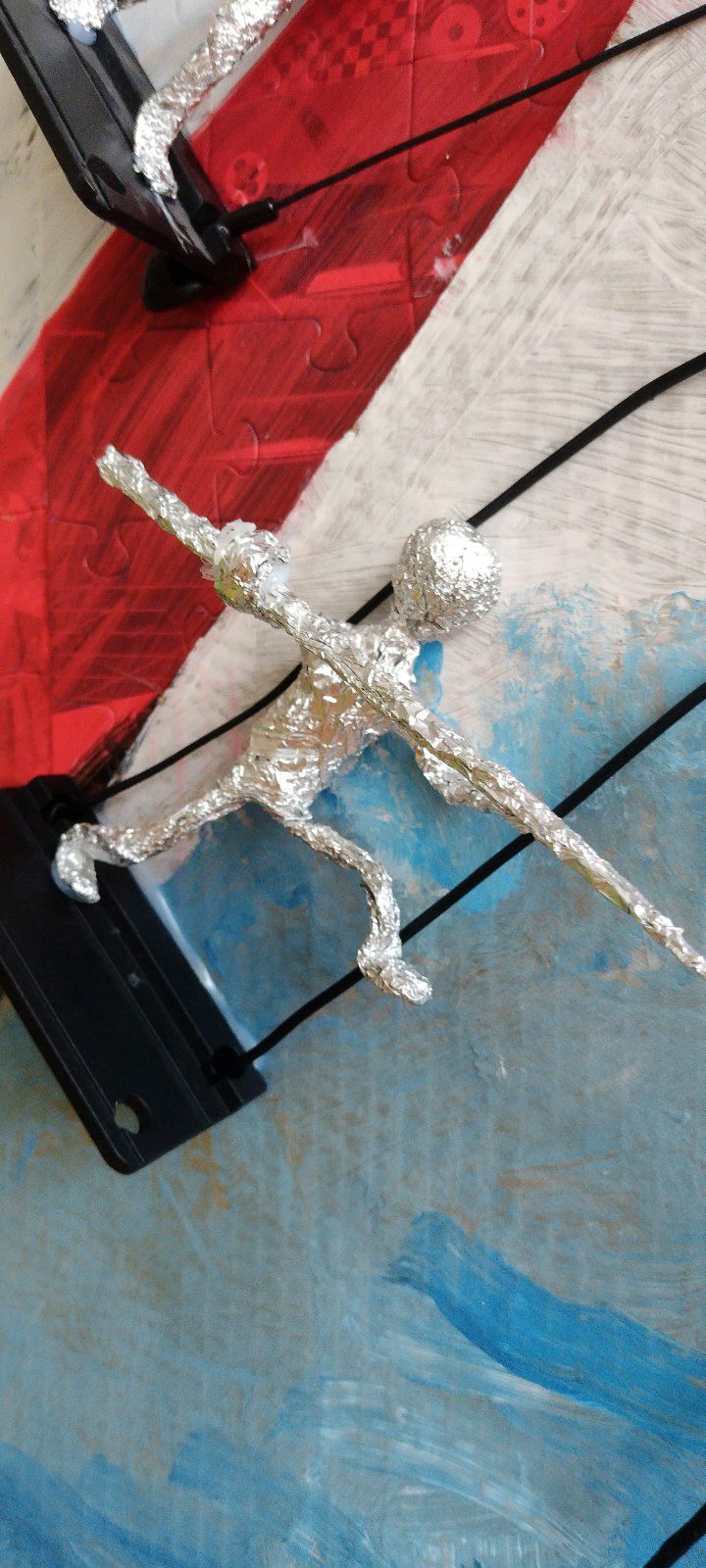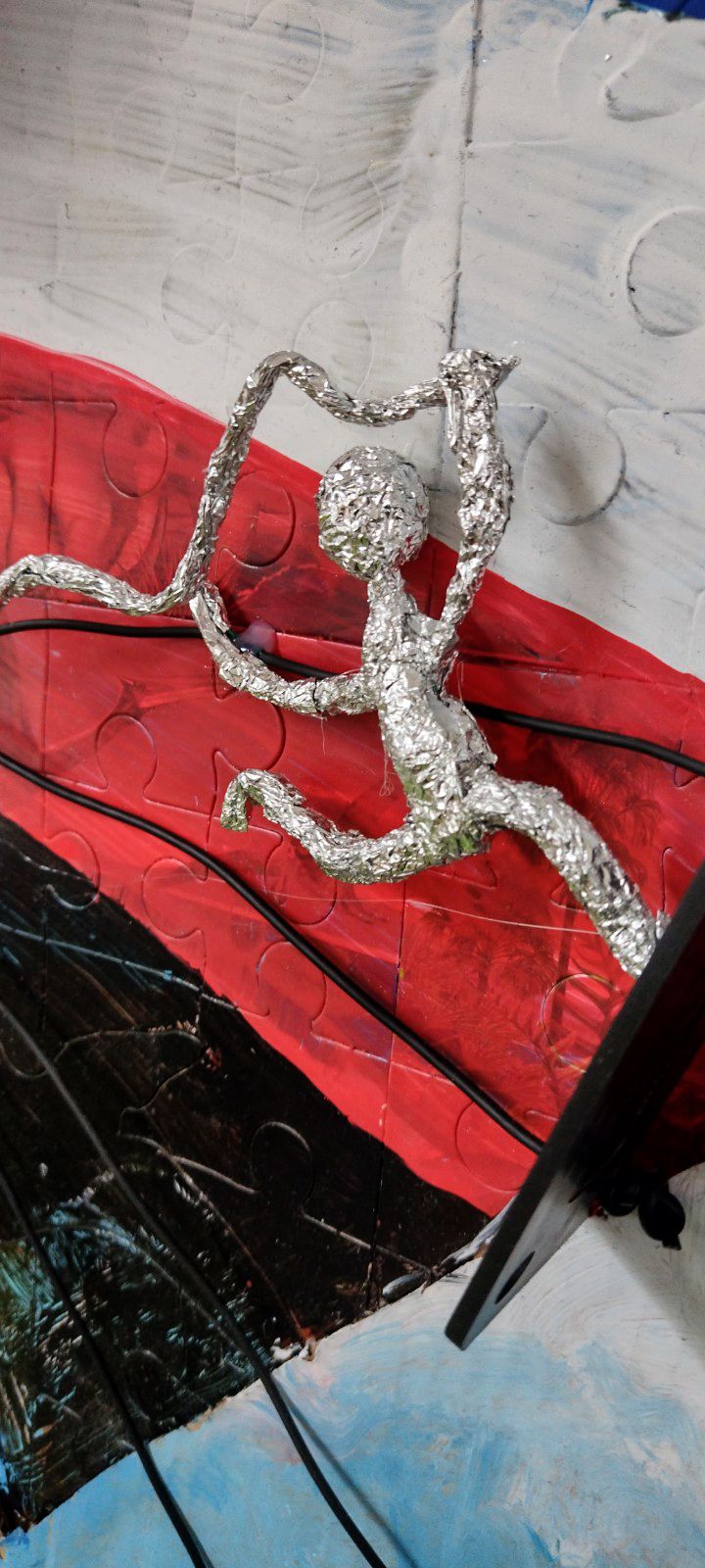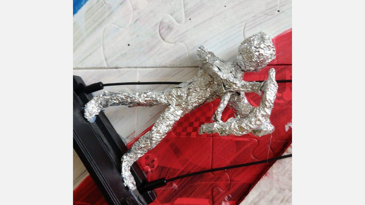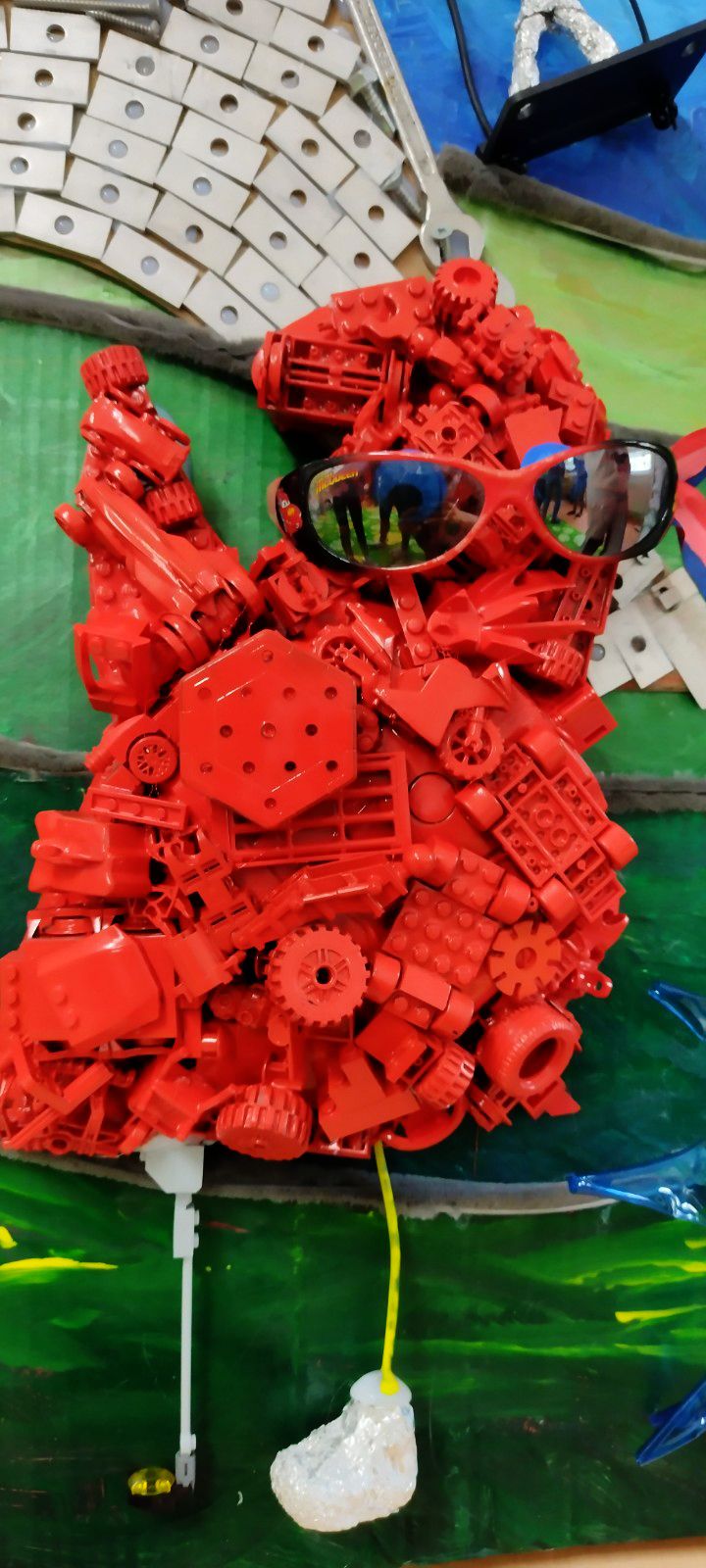 V spodnej časti diela pod vežou mávajú na športovcov fanúšikovia – maskoti OH Paríž 2024. Maskotov sme nakreslili na kartón, na ktorý sme postupne lepili taviacou pištoľou kocky z lega. Nohy sme vyrobili z káblov a alobalu, na protézu nohy sme využili plastovú časť z lega. Oči tvoria vrchnáky z piva + namaľovaný kartón a čierny gombík v strede. Stuha vo farbách francúzskej vlajky je vyfarbená fixkami.