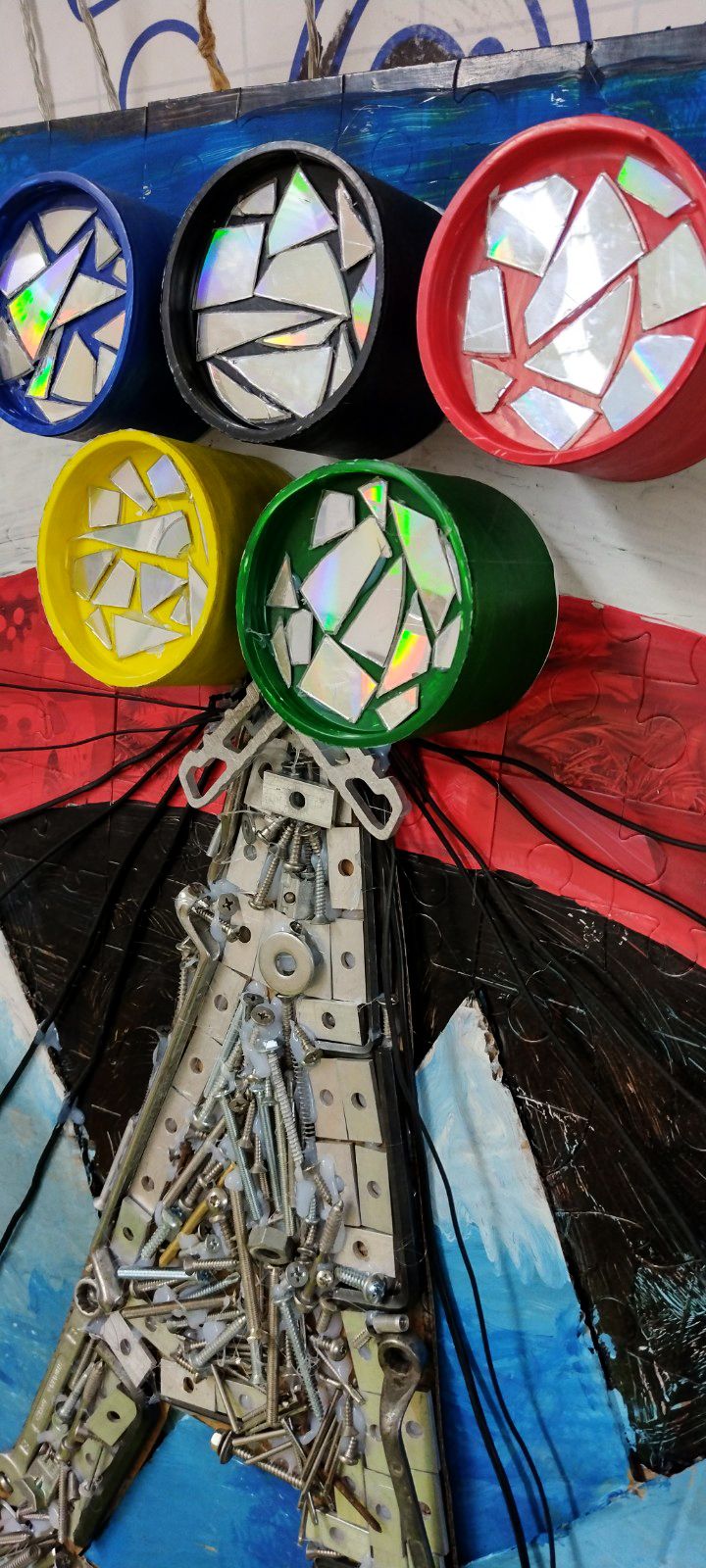 Na špici veže sa vynímajú farebné olympijské kruhy, vyrobené z papierových tubusov a starých CD nosičov.