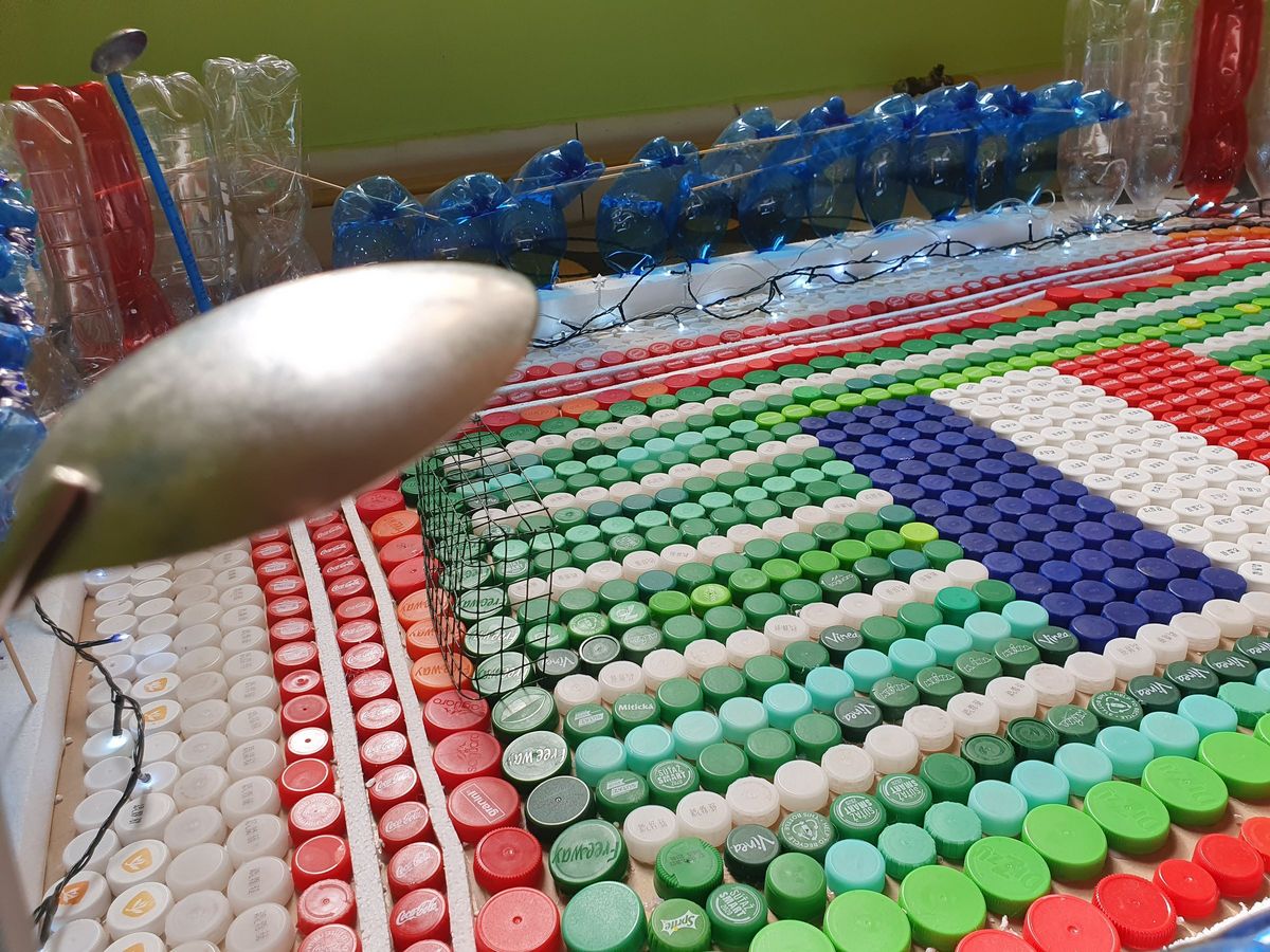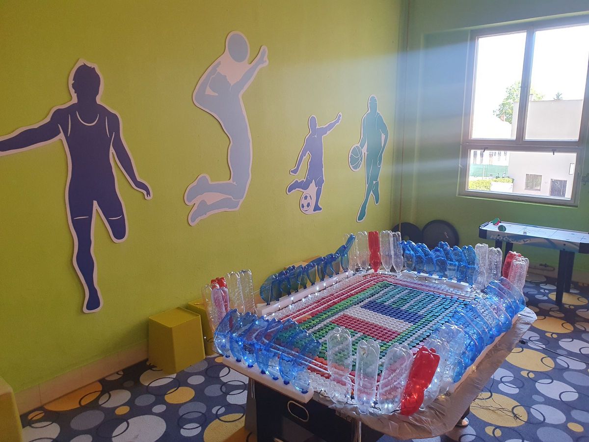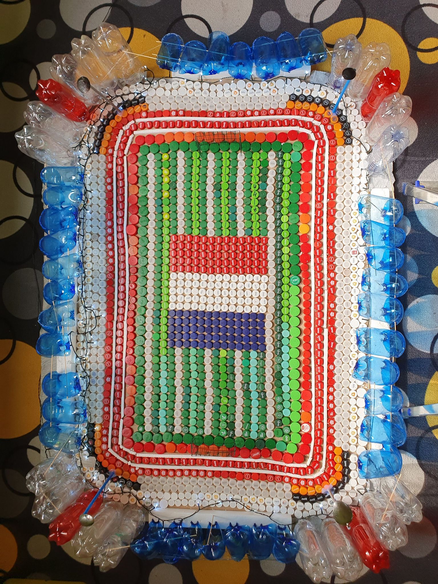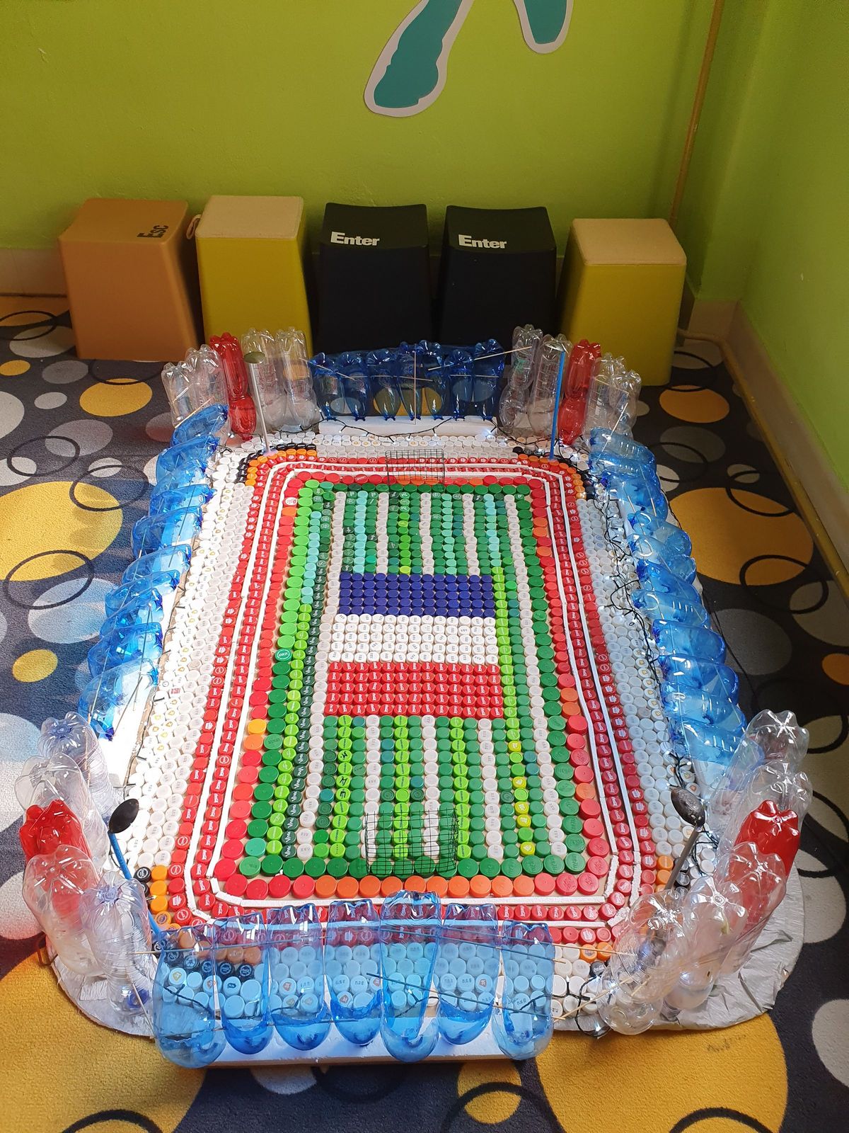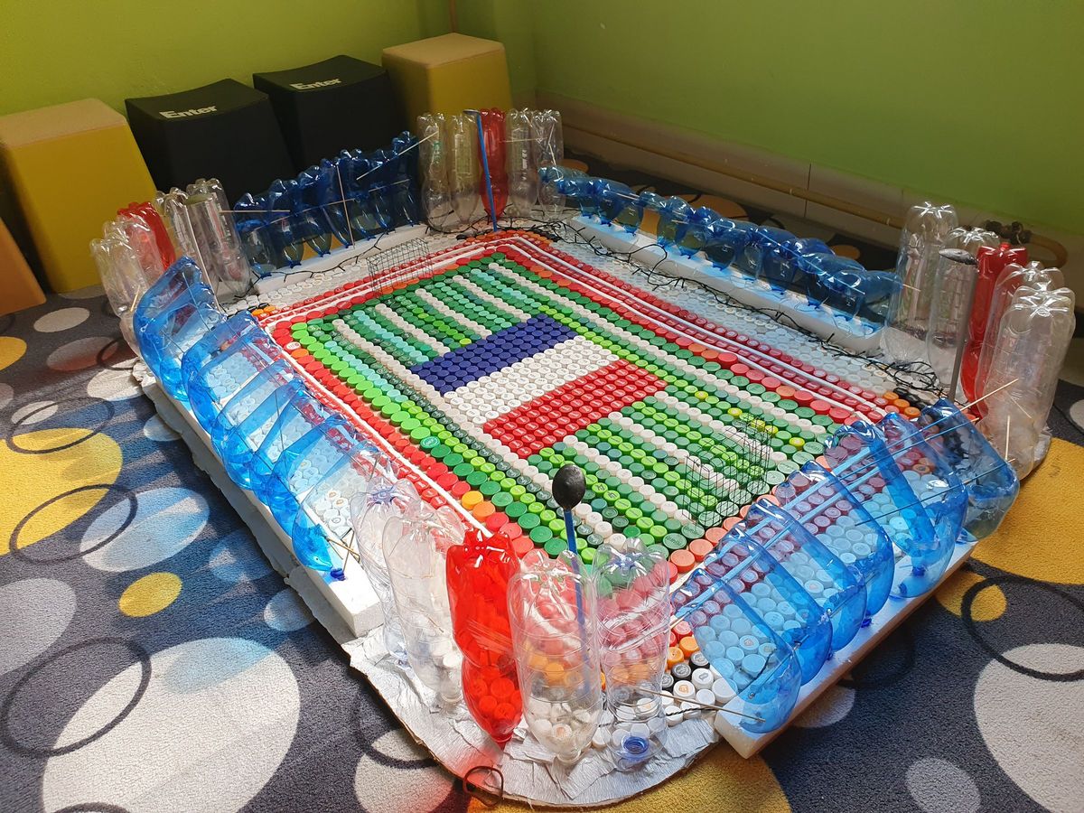 Opis diela : Do Vášho projektu sme sa rozhodli vyrobiť model Olympijského štadióna v Paríži. Ako podklad sme použili kartón z interaktívnej tabule, na ktorý sme tavnou pištoľou pripevňovali vrchnáčiky z plastových fliaš. V jeho centre sme ich usporiadali do motívu vlajky Francúzska, pokračovali sme futbalovým trávnikom. Okolo sme vytvorili bežecké dráhy. Steny štadióna tvoria rozpolené fľaše zakotvené v starom polystyréne, spevnené špajdľami, rovnako vo farbách reprezentujúcich Francúzsko. S ťažšími detailami nám pomohli deviataci. Zo zvyškov plastových rúrok od elektrikárov a starých lyžíc nám vyrobili reflektory do rohov štadióna a tiež zo zvyškov pletiva vytvarovali futbalové bránky. Pri fotení sme náš štadión podsvietili vianočnými svetielkami na dotvorenie atmosféry.