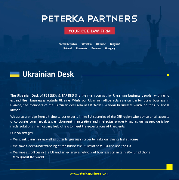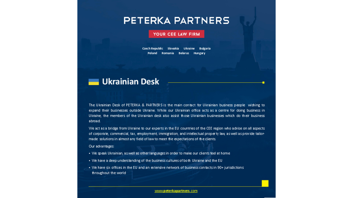 The Ukrainian Desk of PETERKA & PARTNERS is the main contact for Ukrainian business people wishing to expand their businesses outside Ukraine. While our Ukrainian office acts as a centre for doing business in Ukraine, the members of the Ukrainian desk also assist those Ukrainian businesses which do their business abroad.
