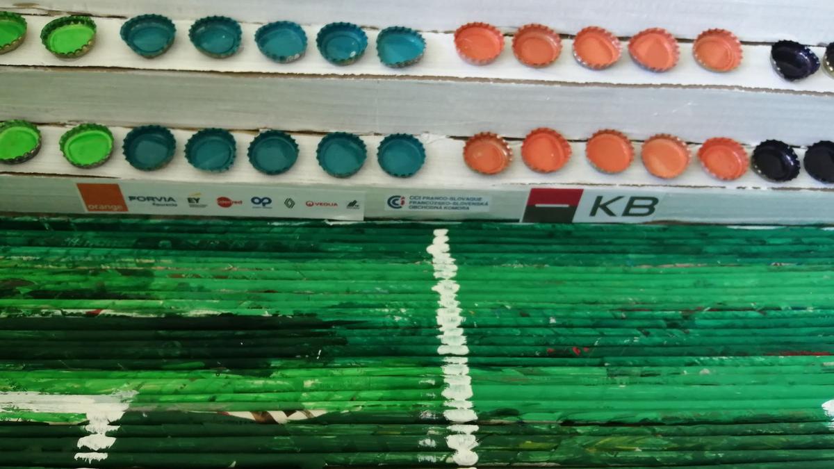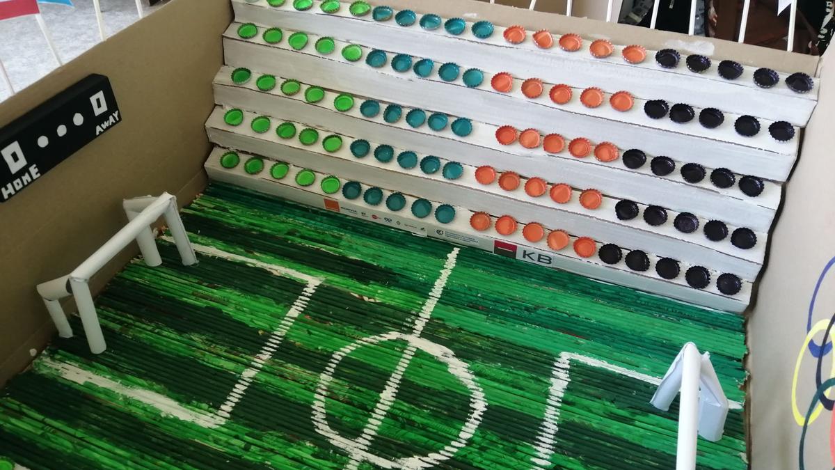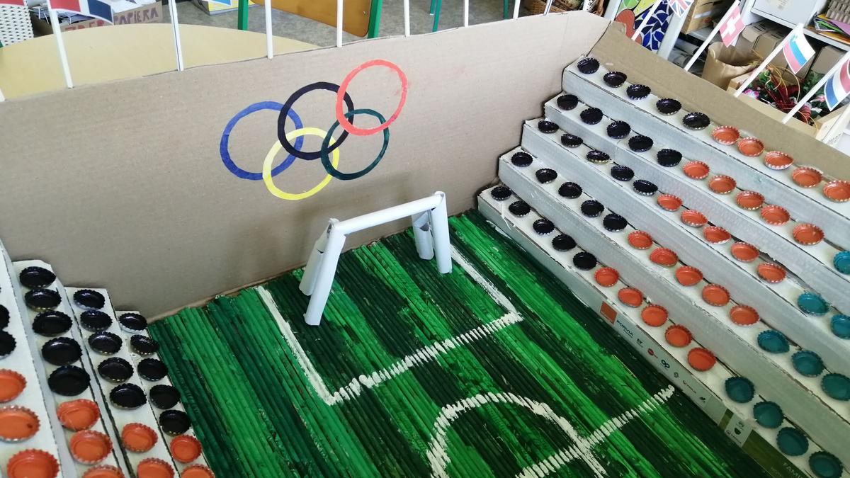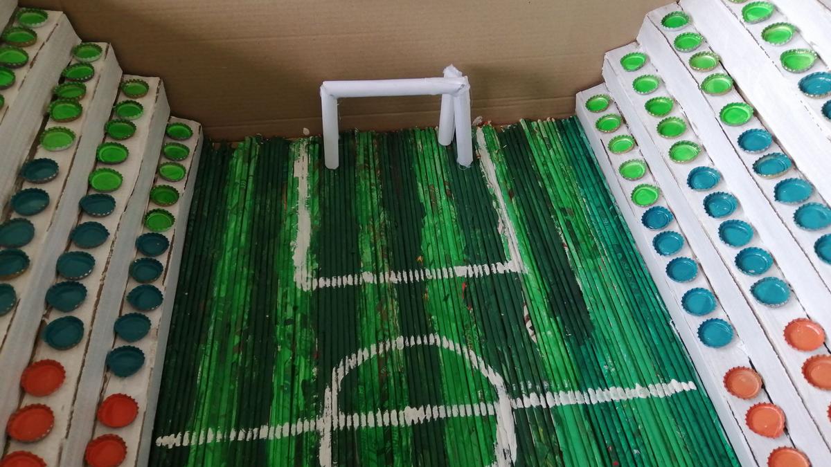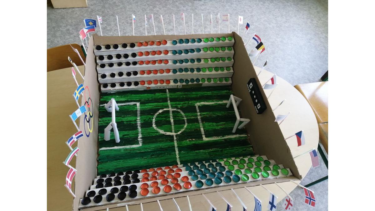 Opis diela : Futbalový štadión je vyrobený z kartónu. Trávnatá plocha sú na tenko stáčané valčeky zo starých novín, natreté nazeleno. Stupienky v hľadisku sú z kartónu a jednotlivé sedačky sú vrchnáky z fliaš. Svetelná tabuľa je zo škatule z náramkových hodiniek. Vlajky štátov sú upevnené na plastových slamkách.