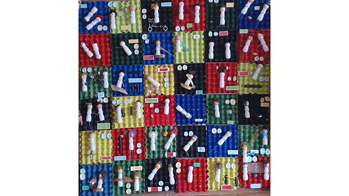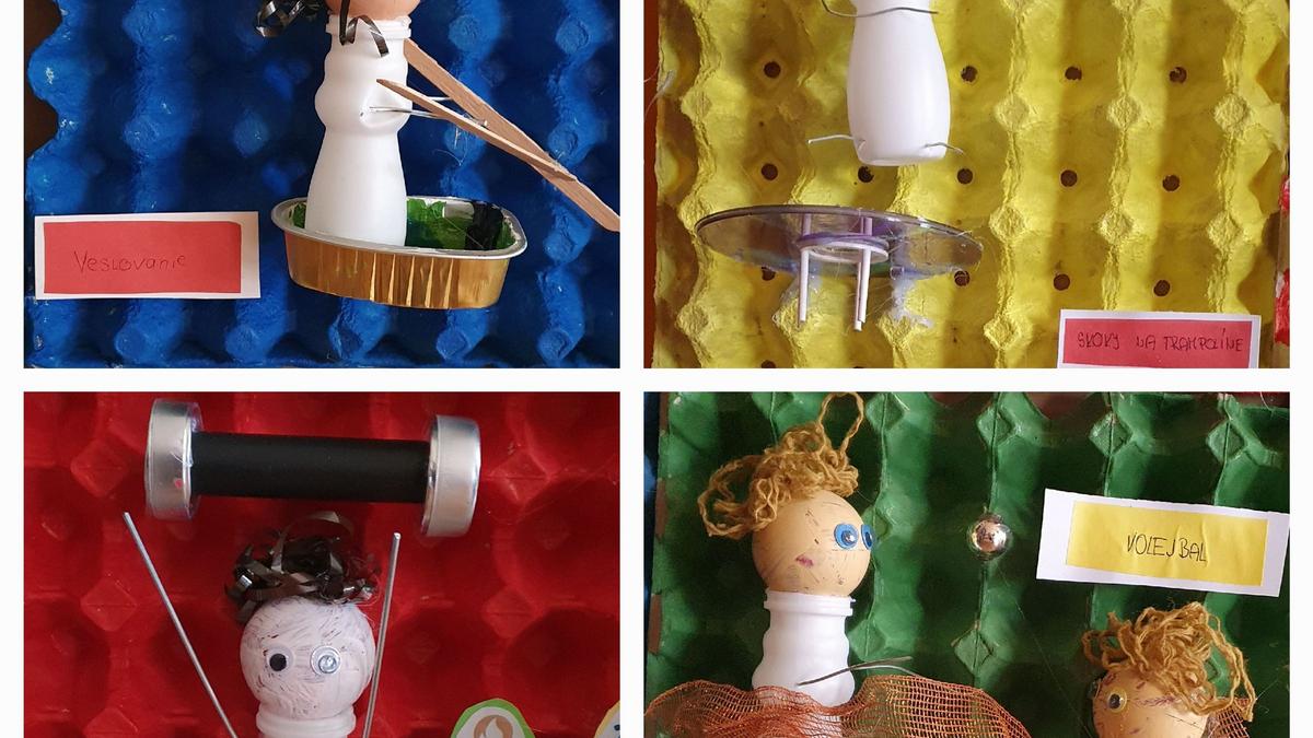 Všetko , až na vytlačený text, farby, a lepidlo je z odpadu . Veríme, že sa Vám naša práca bude páčiť. Možno by si zaslúžila ešte zdokonaľovanie, ale máme len jednu hodinu týždenne výtvarnú výchovu . Niečo urobili aj na technike ( strihanie vešiakov , náter podkladu .. )