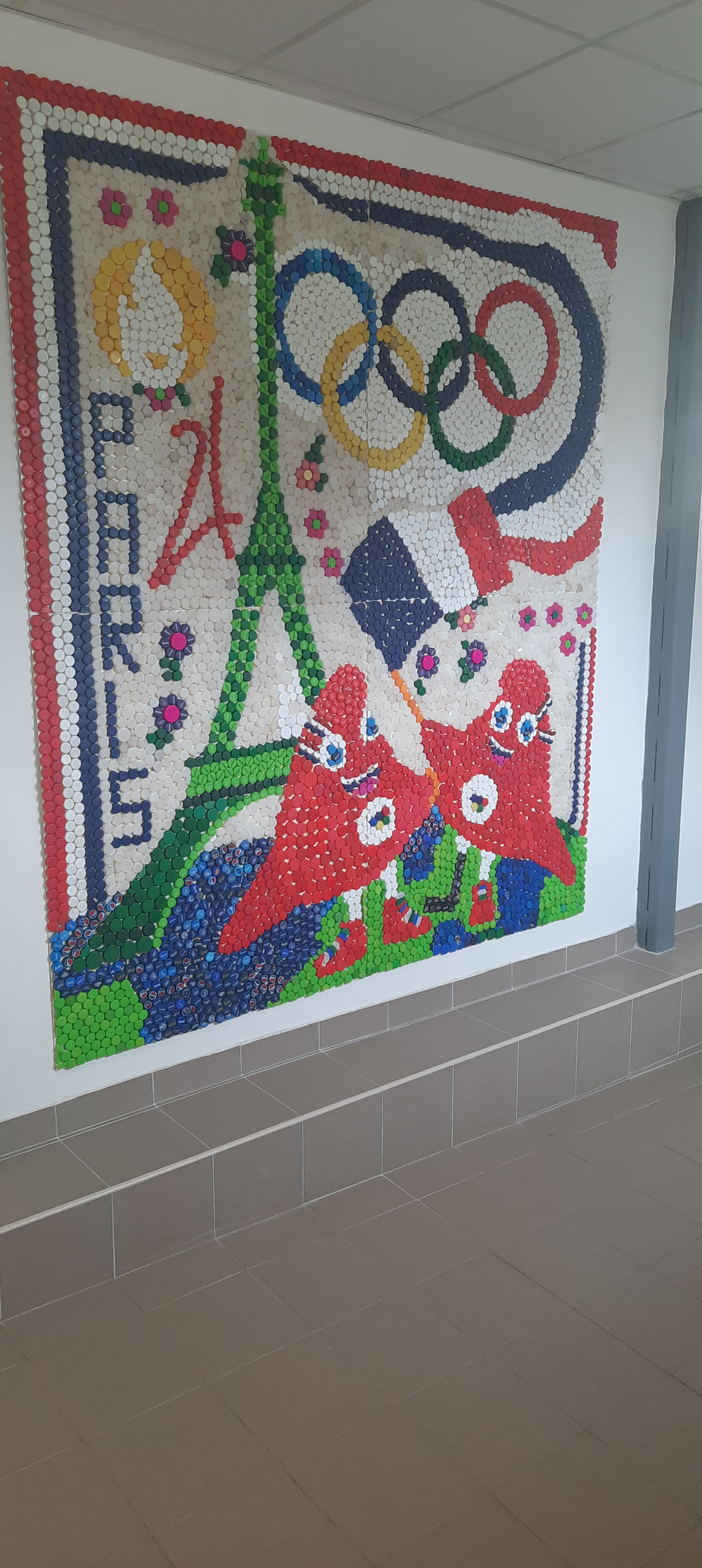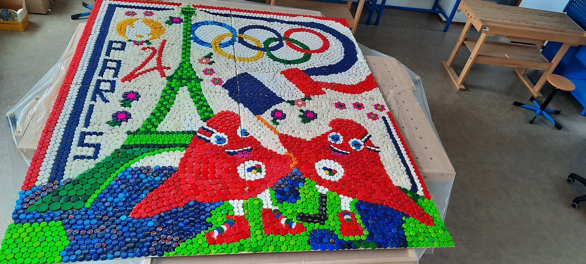 Opis diela: Zbieraniu vrchnákov z PET fliaš sa na našej škole venujeme už pár rokov, pričom sme z nich vytvorili niekoľko krásnych diel. Vaša výzva na vytvorenie umeleckého diela z odpadu nás preto veľmi potešila. Zapojením sa do tohto projektu sme mali možnosť opätovne naším žiakom pripomenúť, že nie všetko, čo ocitne na smetisku, tam definitívne musí skončiť. Prírodu treba chrániť a vyhodeným veciam vedieť dať druhú šancu. V rámci tejto výzvy sme tak prepojili environmentálnu výchovu, biológiu, techniku a výtvarnú výchovu. Na Diele olympiáda v Paríži sú zobrazené olympijské kruhy, maskoti OH - frygické čiapky , logo OH, Eiffelovka. Bolo nám veľkým potešením prijať Vašu výzvu a zapojiť sa do tejto súťaže.