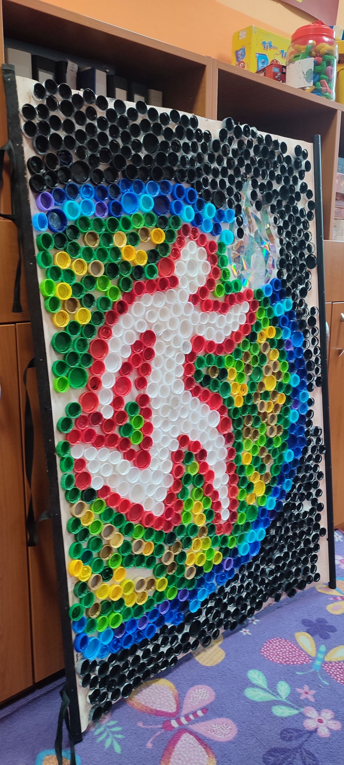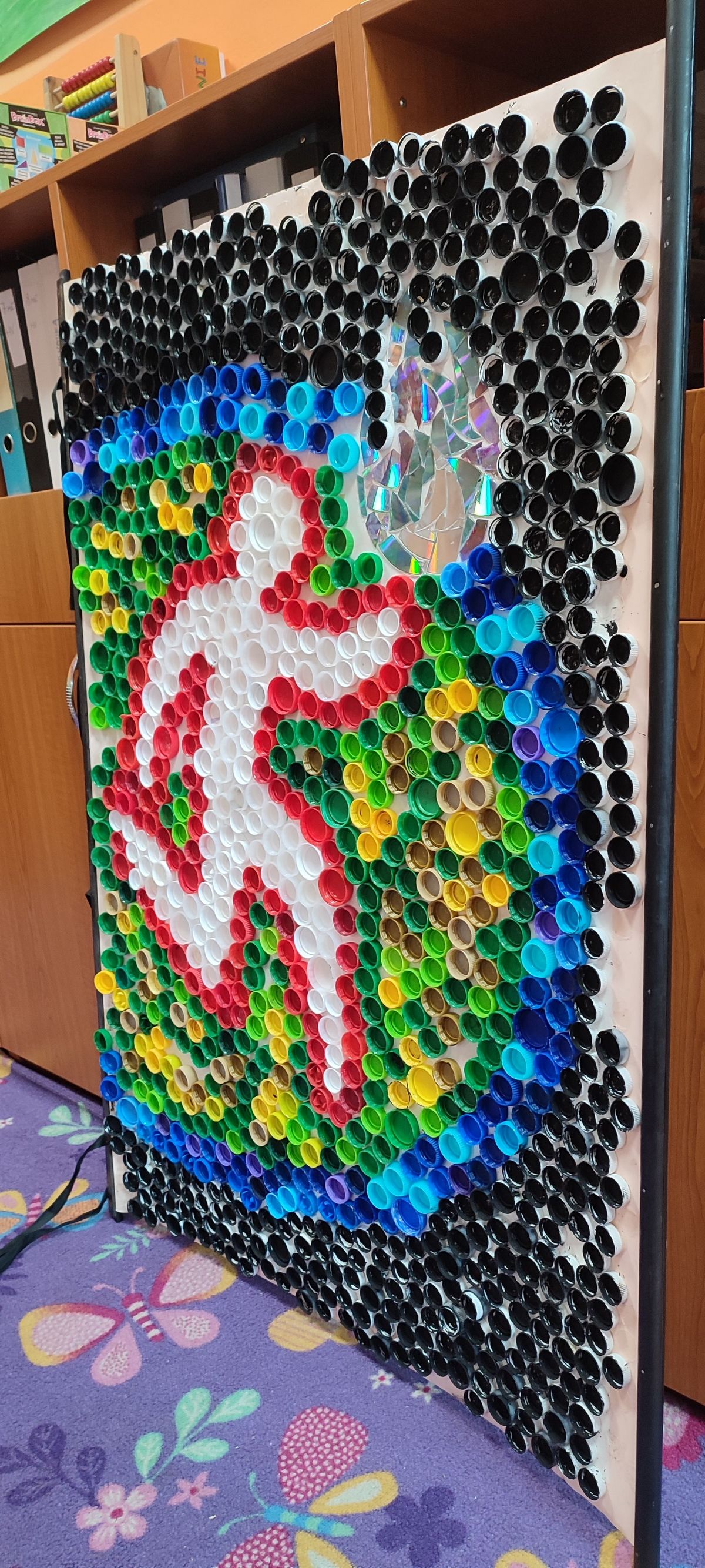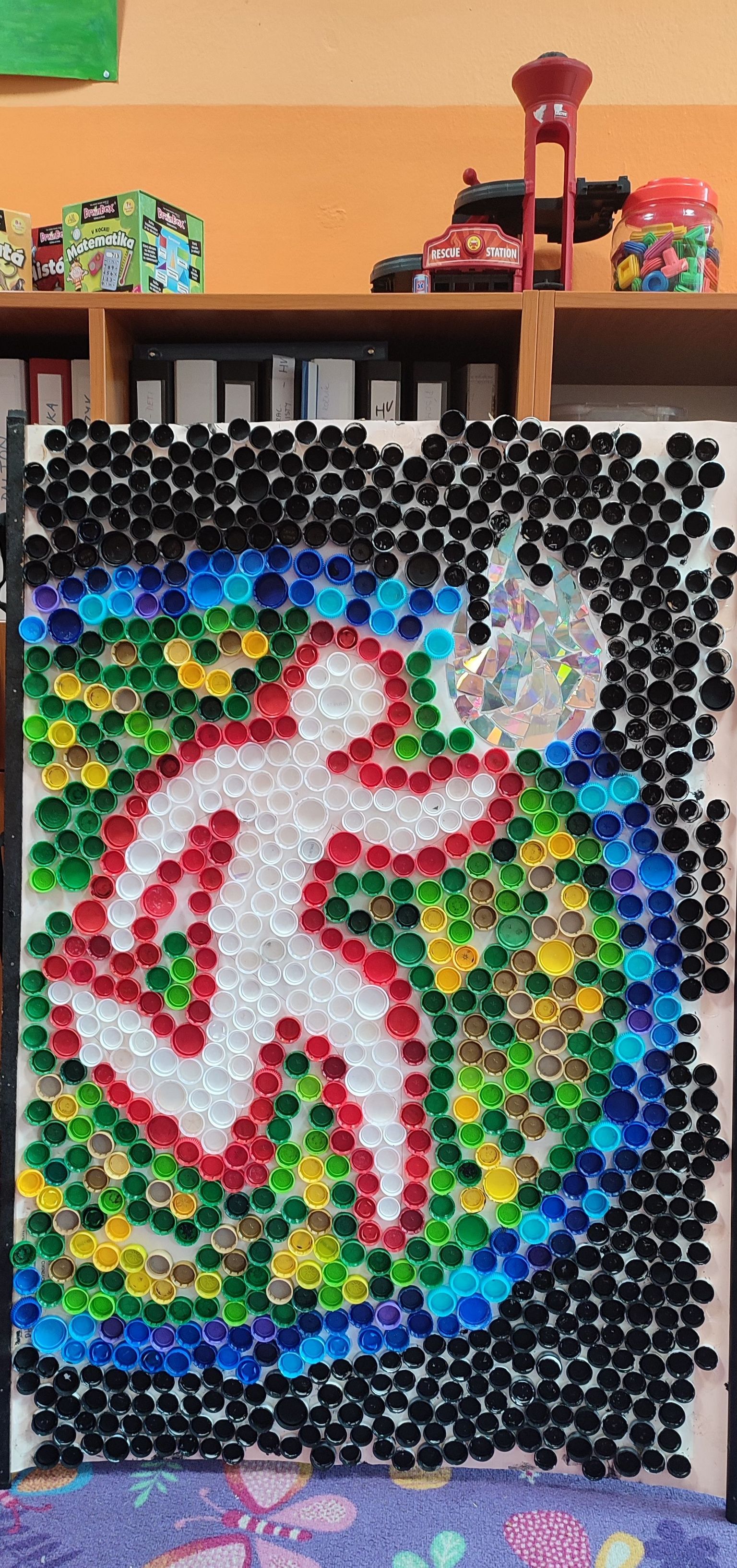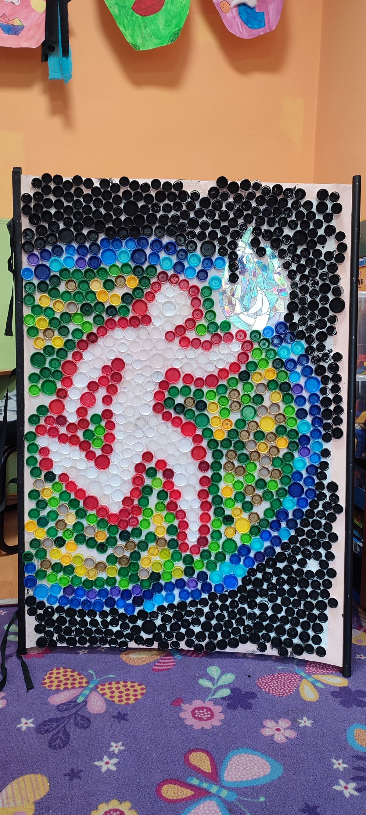 Opis diela (približne 5-10 viet): Dielo, ktoré sme sa rozhodli prezentovať, je obraz vyrobený z plastových vrchnákov, starej mapy a starých CD. Použité farby na obraze reprezentujú jeden svetadiel, je na ňom znázornený bežec držiaci olympijský oheň. Žiaci obraz vyrábali samostatne niekoľko dní. Niektoré vrchnáky bolo potrebné zafarbiť čiernou farbou, aby sme dosiahli požadovaný efekt.