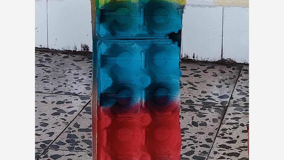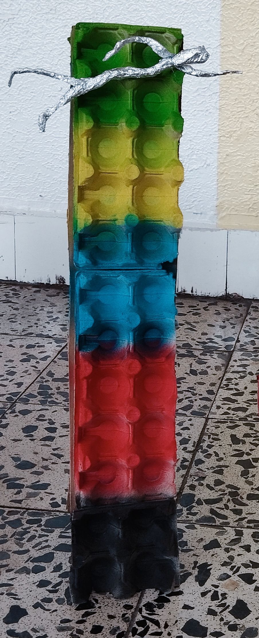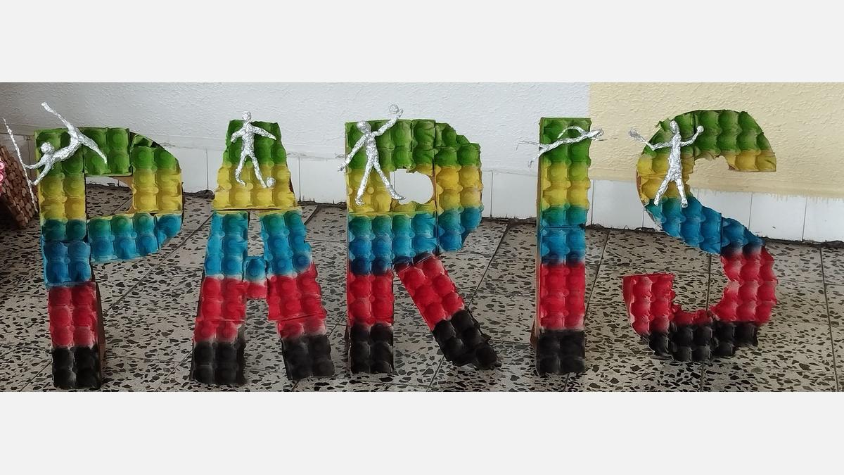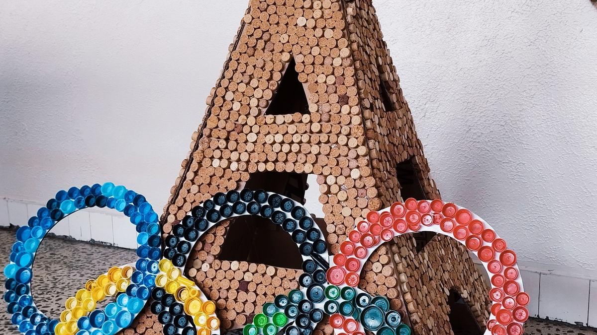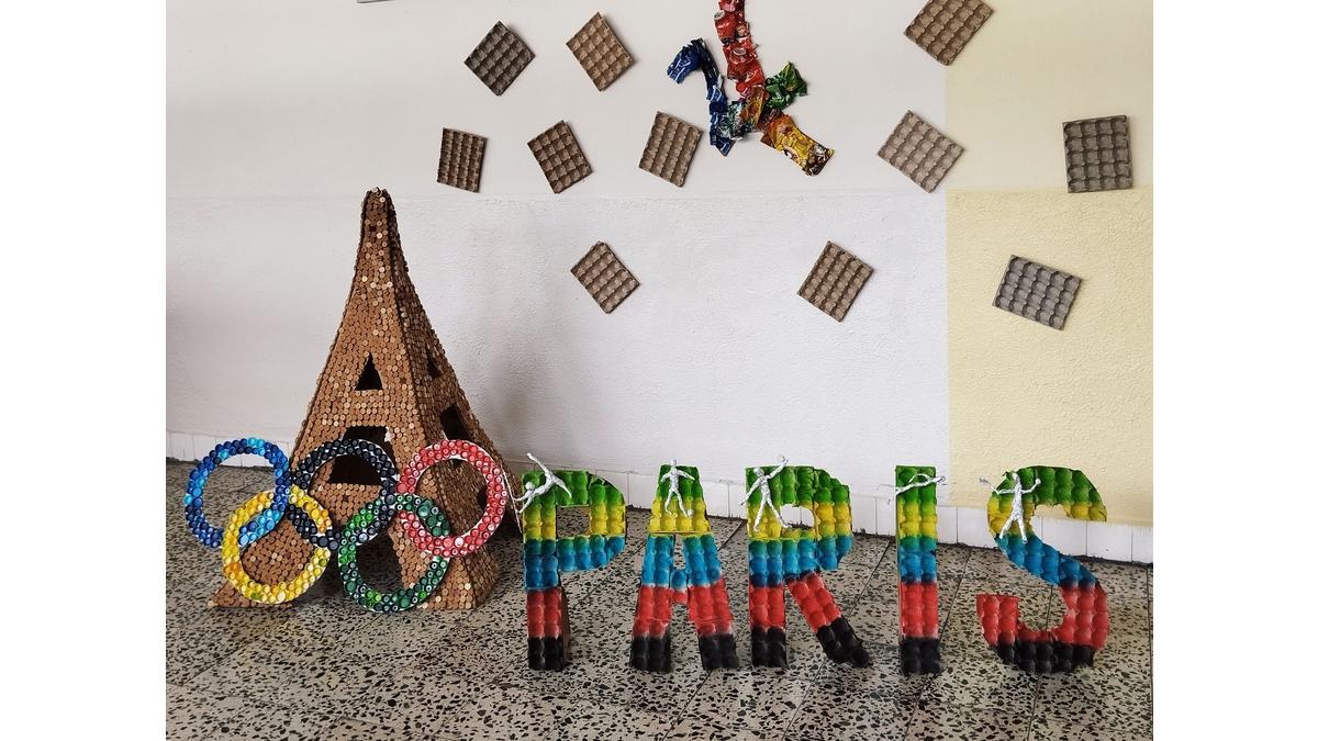 Opis diela : Zozbierané odpadové materiály sme využili na tvorbu umeleckého diela, ktoré má odkaz na Olympijské hry v Paríži a ich hodnoty.