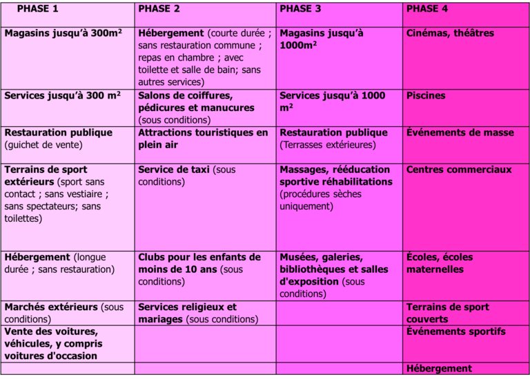 Le plan d’ouverture des établissements est composé de quatre phases, dont la première débute le 22.4.2020.