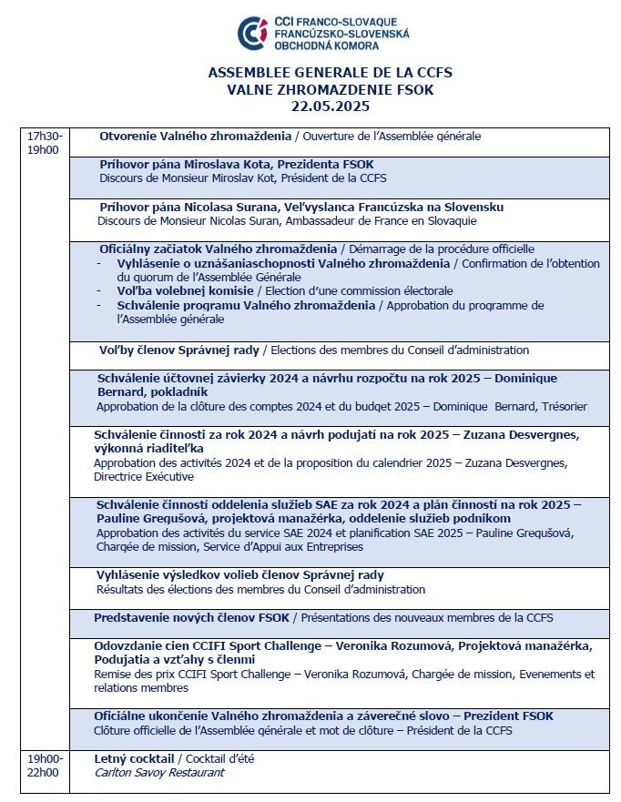 Nous vous invitons cordialement à l’Assemblée Générale de la CCFS qui aura lieu le 22.05.2025 à 17h30 à l’hôtel Radisson Blu Carlton Bratislava.