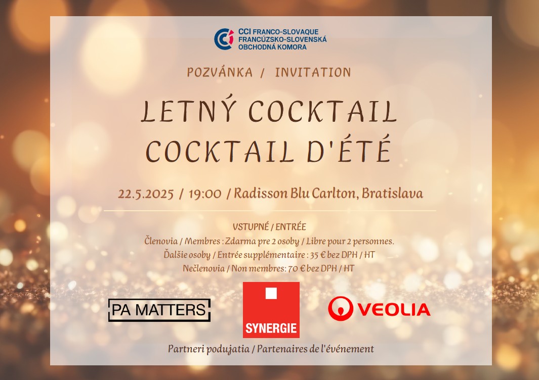 Nous vous invitons chaleureusement au Cocktail d'été qui se tiendra le 22 mai 2025 à 19h00 au Radisson Blu Carlton à Bratislava après la fin de l'Assemblée générale de la CCFS.