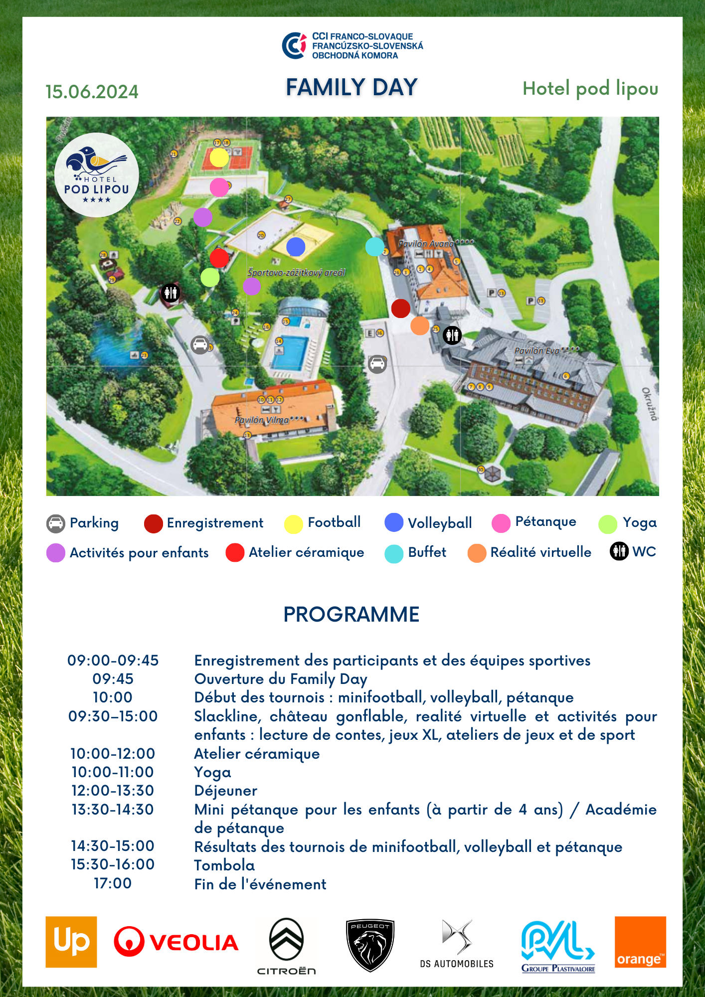 Nous vous invitons cordialement à une nouvelle édition du Family Day de la CCFS qui aura lieu le 15 juin 2024 et qui sera de nouveau l’occasion pour une grande rencontre de la communauté franco-slovaque autour d’activités sportives, avec un programme pour vos enfants et des grillades.