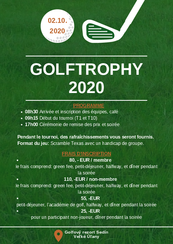 En coopération avec d'autres chambres de commerce étrangères en Slovaquie (ChamCham), nous aimerions vous inviter à l'événement Golftrophy 2020, qui aura lieu le 2 octobre 2020 dans le golf resort SEDIN, situé à 40 km de Bratislava.