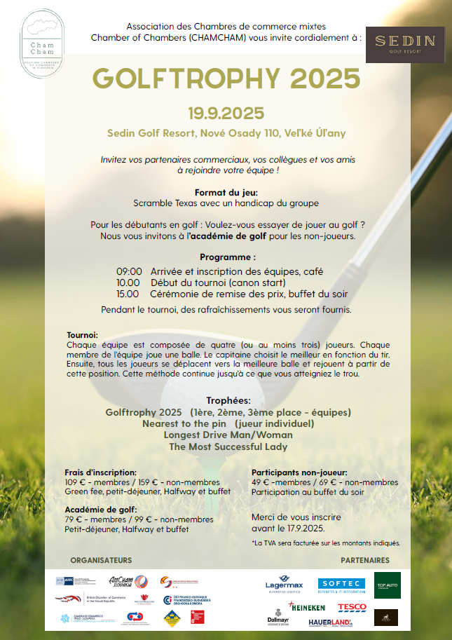 Nous aimerions vous inviter à l‘évènement très apprécié GOLFTROPHY 2025 qui aura lieu le vendredi 19.09.2024 dans le golf resort SEDIN, situé à 40 km de Bratislava. Nous préparons cet événement en coopération avec d'autres Chambres de commerce étrangères en Slovaquie (ChamCham).