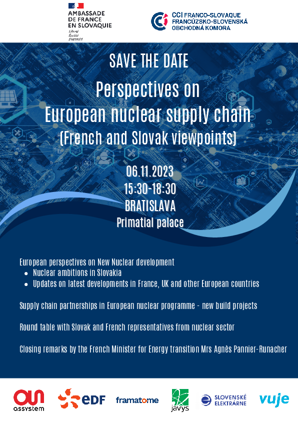 The event will be attended by distinguished guests from Slovakia and France active in the nuclear energy sector (representatives of institutions including ministries, the French Embassy in Slovakia, French and Slovak companies, members of the French-Slovak Chamber and Commerce and other invited guests).