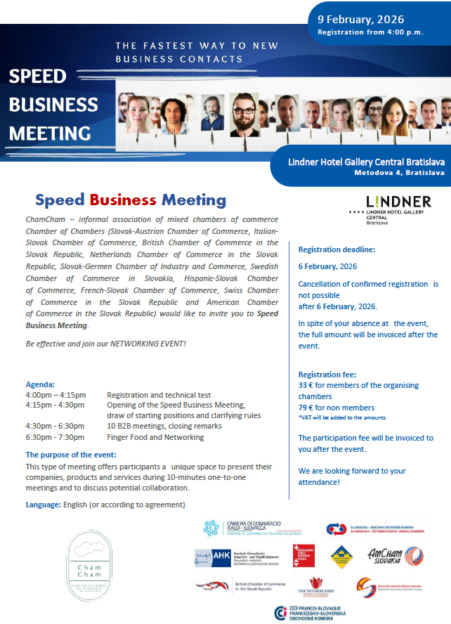 En coopération avec d'autres chambres de commerce étrangères en Slovaquie, nous vous invitons à la première édition du Speed Business Meeting de cette année.
