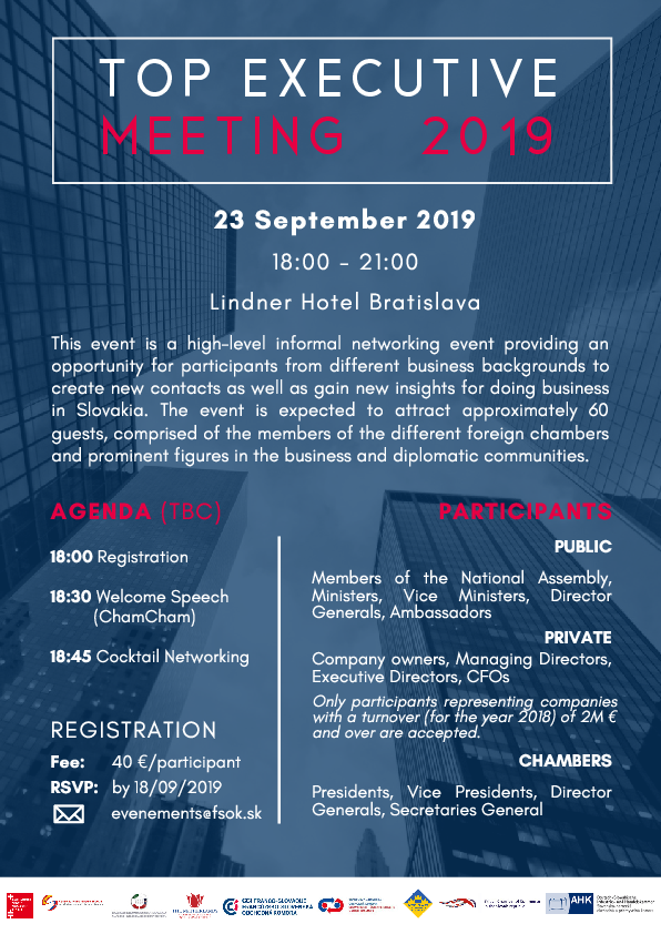 En coopération avec d´autres chambres de commerces en Slovaquie, nous vous invitons cordialement à l´événement TOP EXECUTIVE MEETING qui aura lieu 23 septembre 2019 de 18h00-21h00 à Lindner Hotel Bratislava. Des représentants des secteurs public et privé ainsi que des chambres de commerce participeront à l'événement. Secteur public: membres du Conseil national, ministres, secrétaires d'État, directeurs généraux, ambassadeurs Secteur privé *: propriétaires d'entreprise, directeurs généraux, directeurs exécutifs, directeurs financiers * Uniquement les entreprises ayant un chiffre d'affaires d'au moins 2 millions € en 2018 seront acceptées. Chambres de commerce: présidents, vice-présidents, directeurs généraux, secrétaires généraux