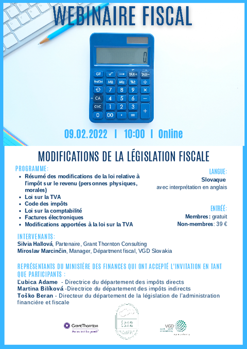 Les Chambres de commerce étrangères, en coopération avec Grant Thornton Consulting et VGD SLOVAKIA s.r.o., vous invitent au Webinaire fiscal de ChamCham sous les auspices du Ministère des finances de la République slovaque.