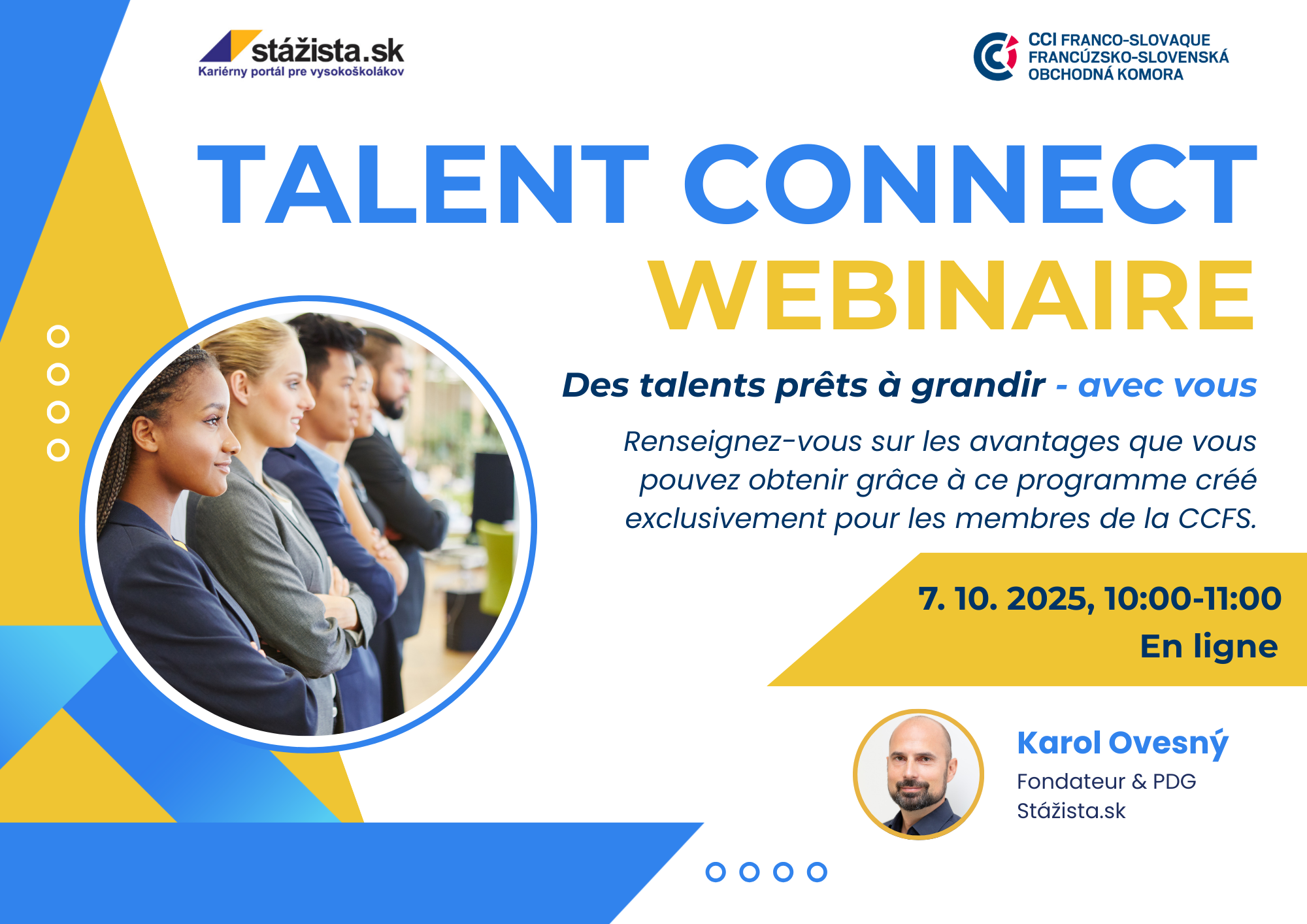 Nous avons le plaisir de vous inviter à un webinaire d’information au cours duquel nous vous présenterons en détail notre nouveau projet TALENT CONNECT – Programme de stages de la CCFS, lancé en collaboration exclusive avec notre membre, le portail Stážista.sk. ?