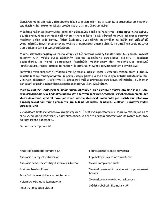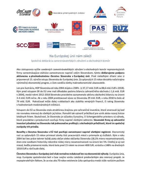 V súvislosti s blížiacim sa 15. výročím vstupu Slovenska do EÚ a s nadchádzajúcimi voľbami do Európskeho parlamentu, Francúzsko-slovenská obchodná komora spolu s ďalšími 12 zamestnávateľskými združeniami a obchodnými komorami vyjadrila svoju podporu členstva SR v EÚ v spoločnej deklarácii, ktorá poukazuje na výhody plynúce z európskeho projektu.