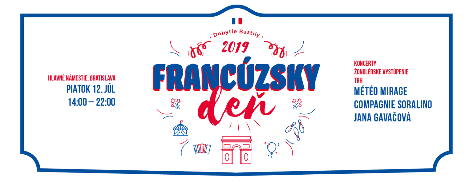 V spolupráci s Francúzskym veľvyslanectvom a Francúzskym inštitútom Vás srdečne pozývame na oslavu francúzskeho štátneho sviatku pri príležitosti výročia Dobytia Bastily, ktorá sa bude konať v piatok 12. júla 2019 na Hlavnom námestí v Bratislave. Od 14:00 tu na Vás bude čakať bohatý hudobný a kultúrny program, trh s francúzskymi výrobkami, lahodnými jedlami a osviežujúcimi nápojmi, prezentácia francúzskych spoločností či deň otvorených dverí vo Francúzskom inštitúte.