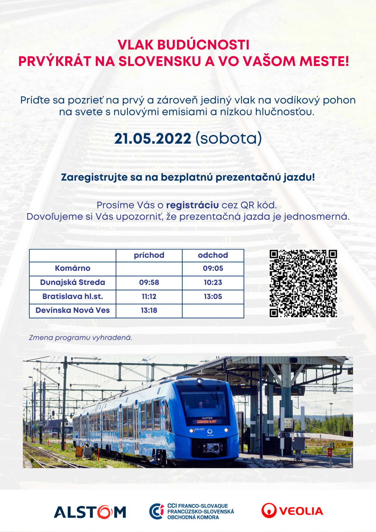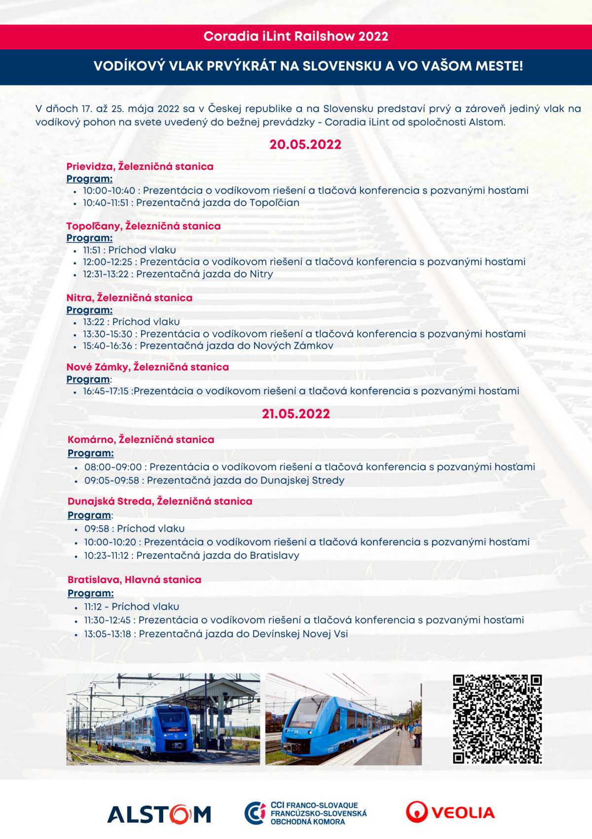 Už tento piatok 20. mája a sobotu 21. mája sa na trati slovenských železníc predstaví vlak Coradia iLint™ spoločnosti Alstom : neváhajte a príďte sa pozrieť naprvý a zároveň jediný vlak na vodíkový pohon na svete, s nulovými emisiami CO2 a nízkou hladinou hluku, uvedený do bežnej prevádzky !