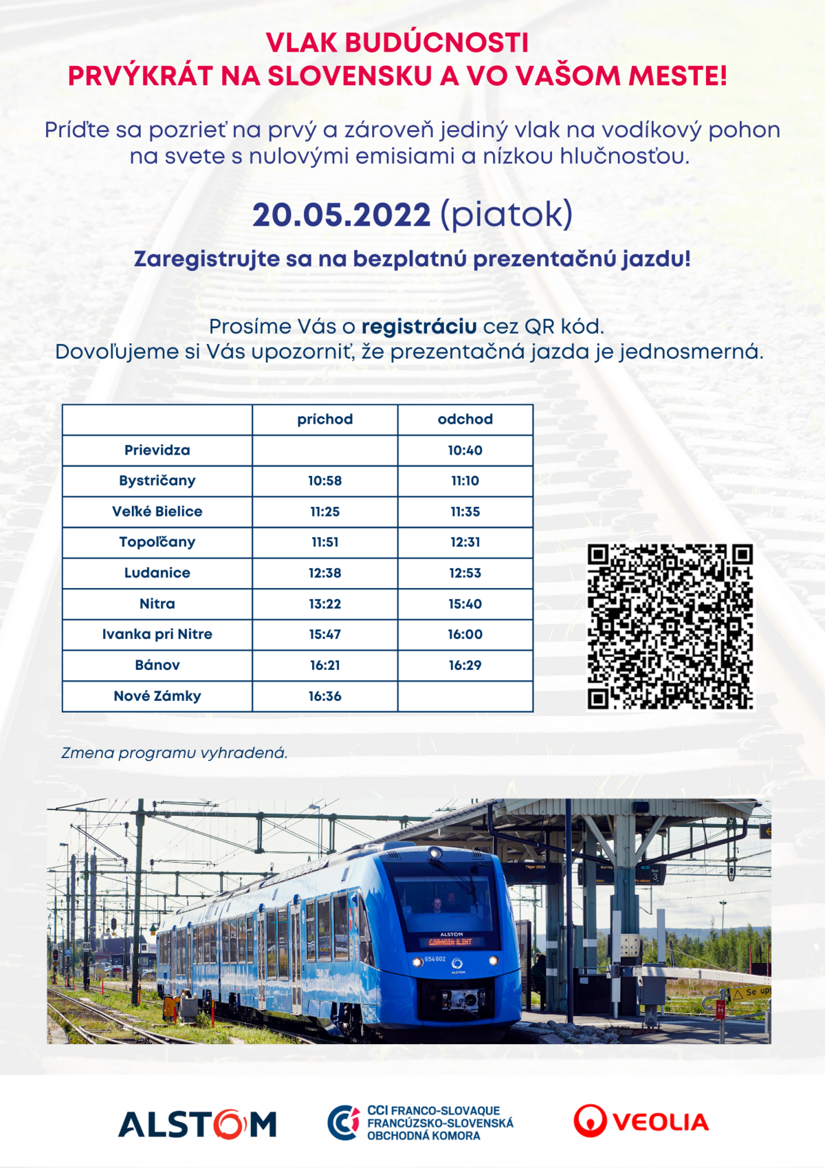 Vlak zastaví vo viacerých staniciach, pôjde z Prievidze cez Topoľčany, Nitru, Nové Zámky (20.5.), Komárno a Dunajskú Stredu do Bratislavy (21.5.). Všetky praktické informácie (cestovné poriadky, stanice atď.) nájdete TU. Záujemcovia budú zároveň môcť absolvovať bezplatnú jednosmernú jazdu vo vodíkovom vlaku. Prosíme vás, aby ste sa na jazdu registrovali cez QR kód v programe alebo nám napísali email na adresu : evenements(@)fsok.sk.