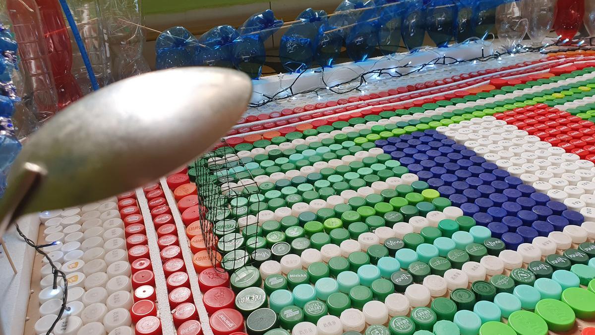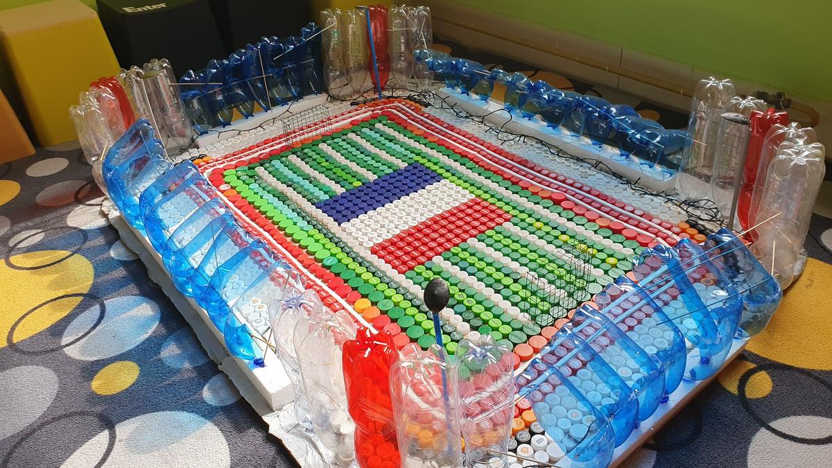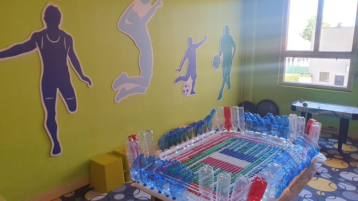 Opis diela : Do Vášho projektu sme sa rozhodli vyrobiť model Olympijského štadióna v Paríži. Ako podklad sme použili kartón z interaktívnej tabule, na ktorý sme tavnou pištoľou pripevňovali vrchnáčiky z plastových fliaš. V jeho centre sme ich usporiadali do motívu vlajky Francúzska, pokračovali sme futbalovým trávnikom. Okolo sme vytvorili bežecké dráhy. Steny štadióna tvoria rozpolené fľaše zakotvené v starom polystyréne, spevnené špajdľami, rovnako vo farbách reprezentujúcich Francúzsko. S ťažšími detailami nám pomohli deviataci. Zo zvyškov plastových rúrok od elektrikárov a starých lyžíc nám vyrobili reflektory do rohov štadióna a tiež zo zvyškov pletiva vytvarovali futbalové bránky. Pri fotení sme náš štadión podsvietili vianočnými svetielkami na dotvorenie atmosféry.