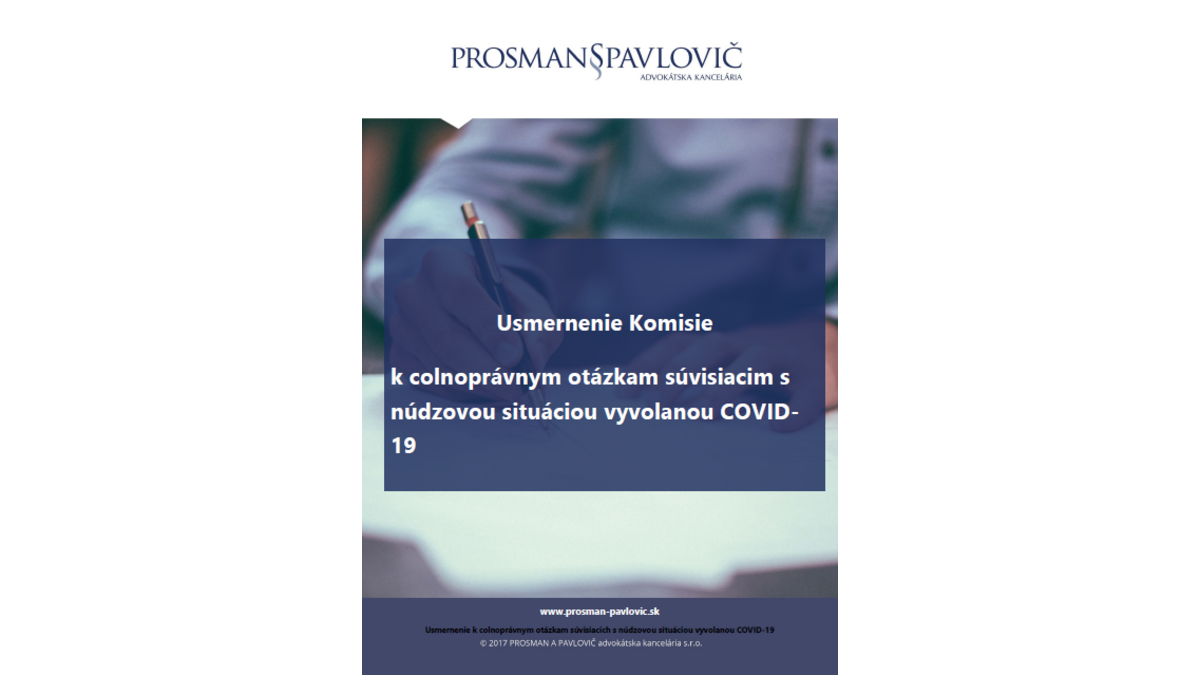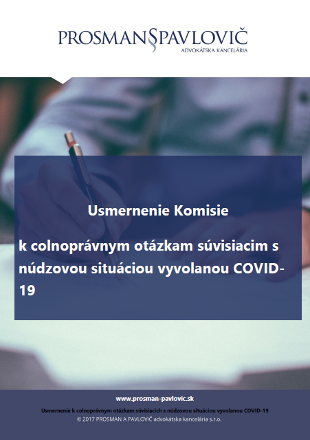 Európska komisia dňa 30.03.2020 vydala usmernenie k colnoprávnym otázkam súvisiacich s núdzovou situáciou vyvolanou COVID-19. Toto usmernenie nájdete v slovenčine v newsletteri nášho člena Prosman a Pavlovič advokátska kancelária, s.r.o.