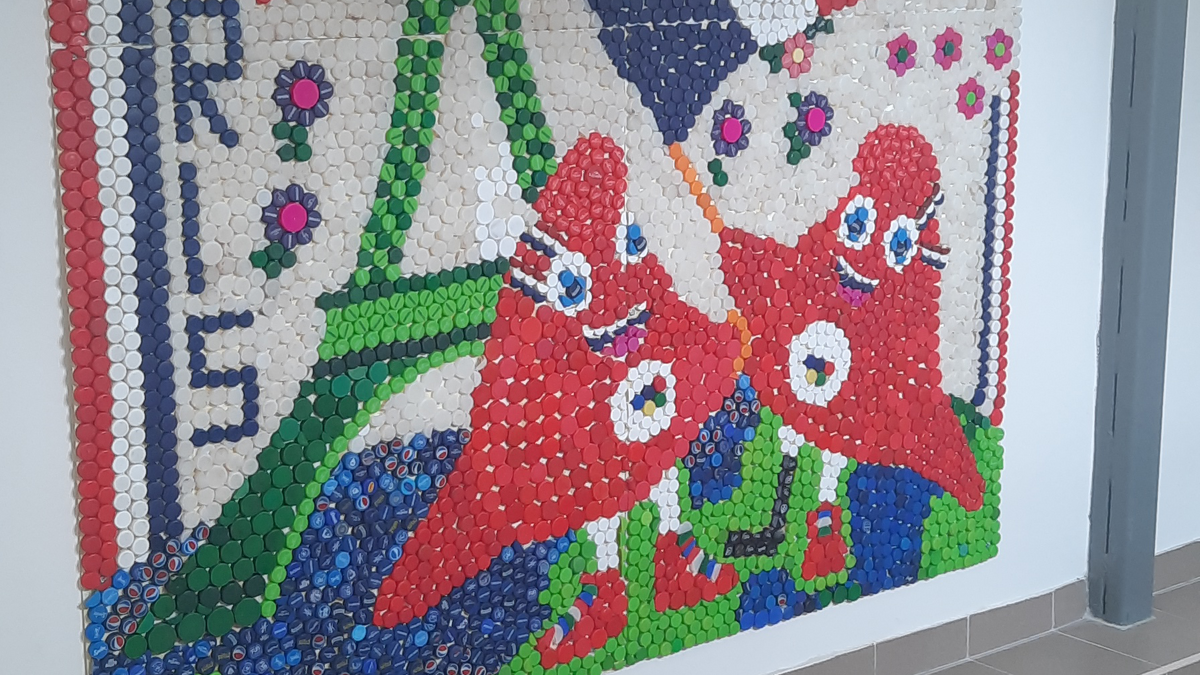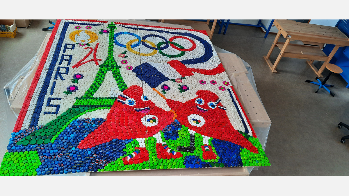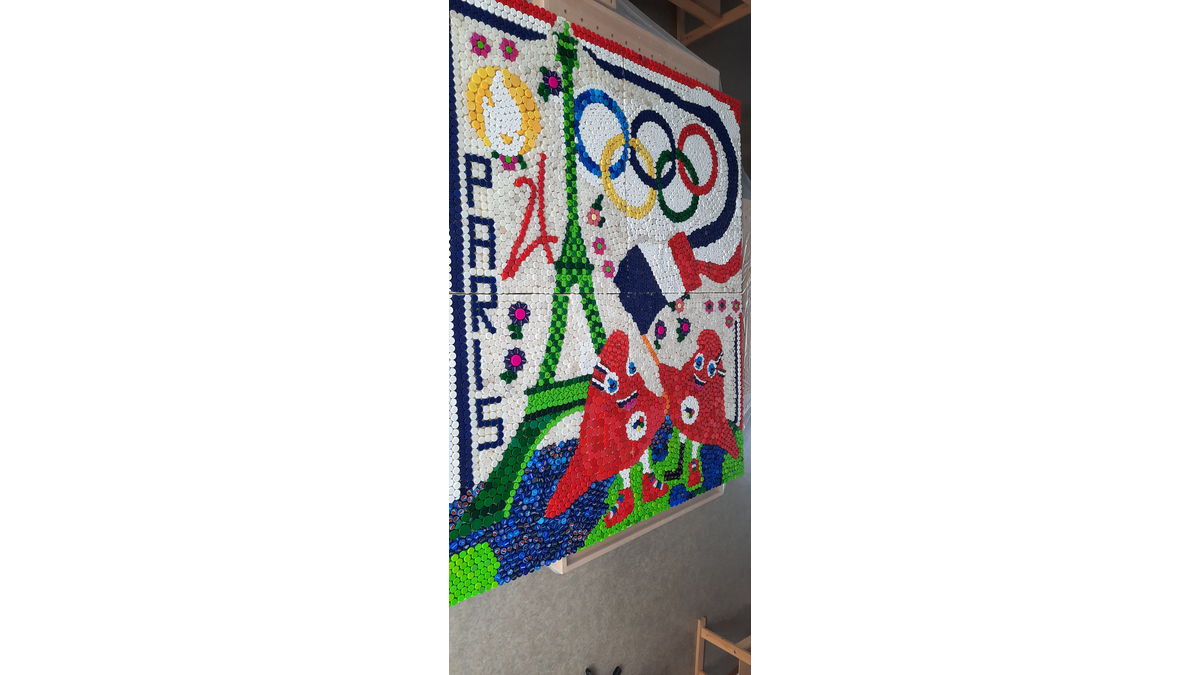 Opis diela: Zbieraniu vrchnákov z PET fliaš sa na našej škole venujeme už pár rokov, pričom sme z nich vytvorili niekoľko krásnych diel. Vaša výzva na vytvorenie umeleckého diela z odpadu nás preto veľmi potešila. Zapojením sa do tohto projektu sme mali možnosť opätovne naším žiakom pripomenúť, že nie všetko, čo ocitne na smetisku, tam definitívne musí skončiť. Prírodu treba chrániť a vyhodeným veciam vedieť dať druhú šancu. V rámci tejto výzvy sme tak prepojili environmentálnu výchovu, biológiu, techniku a výtvarnú výchovu. Na Diele olympiáda v Paríži sú zobrazené olympijské kruhy, maskoti OH - frygické čiapky , logo OH, Eiffelovka. Bolo nám veľkým potešením prijať Vašu výzvu a zapojiť sa do tejto súťaže.