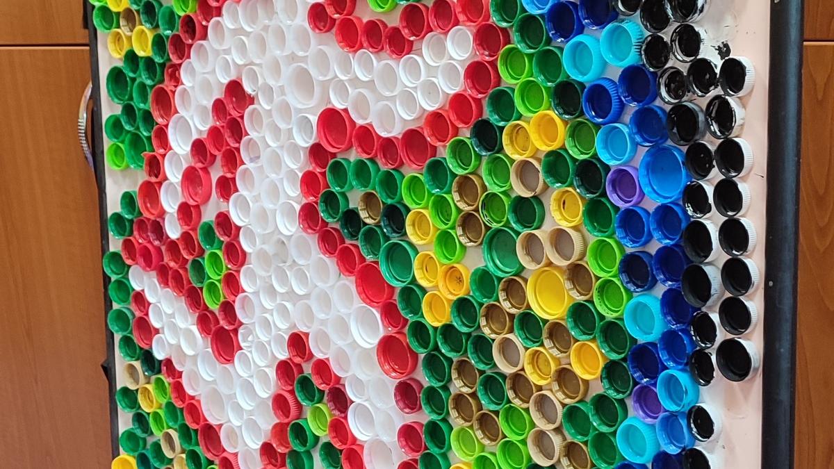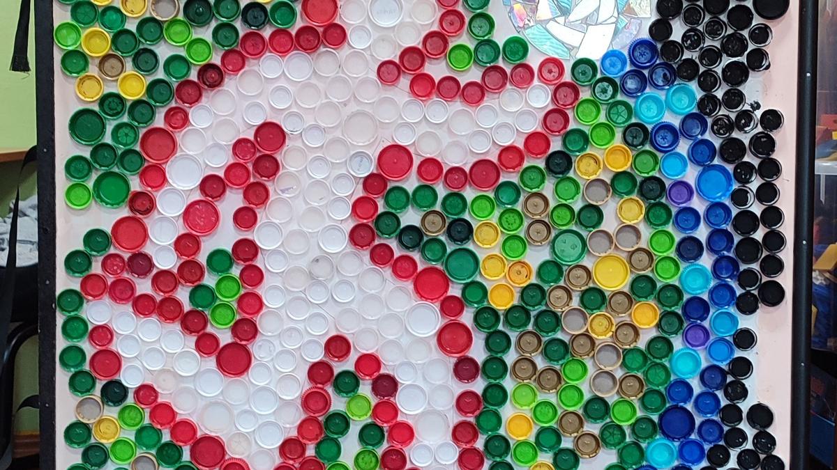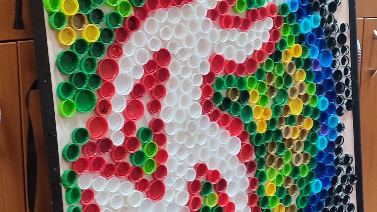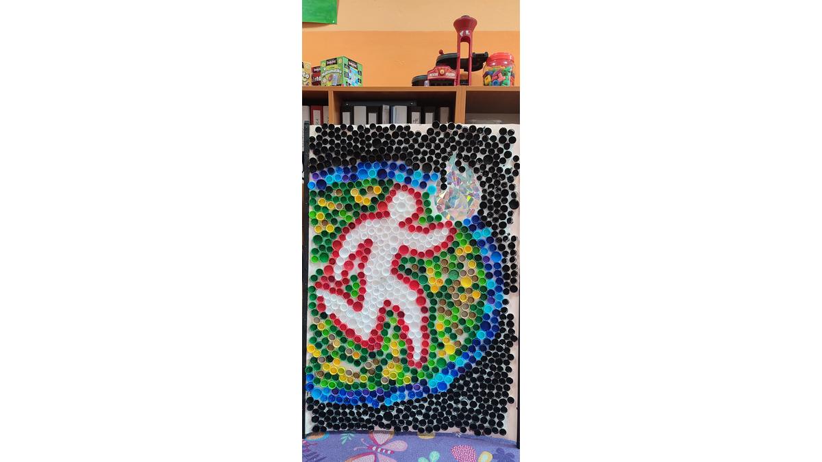 Opis diela (približne 5-10 viet): Dielo, ktoré sme sa rozhodli prezentovať, je obraz vyrobený z plastových vrchnákov, starej mapy a starých CD. Použité farby na obraze reprezentujú jeden svetadiel, je na ňom znázornený bežec držiaci olympijský oheň. Žiaci obraz vyrábali samostatne niekoľko dní. Niektoré vrchnáky bolo potrebné zafarbiť čiernou farbou, aby sme dosiahli požadovaný efekt.