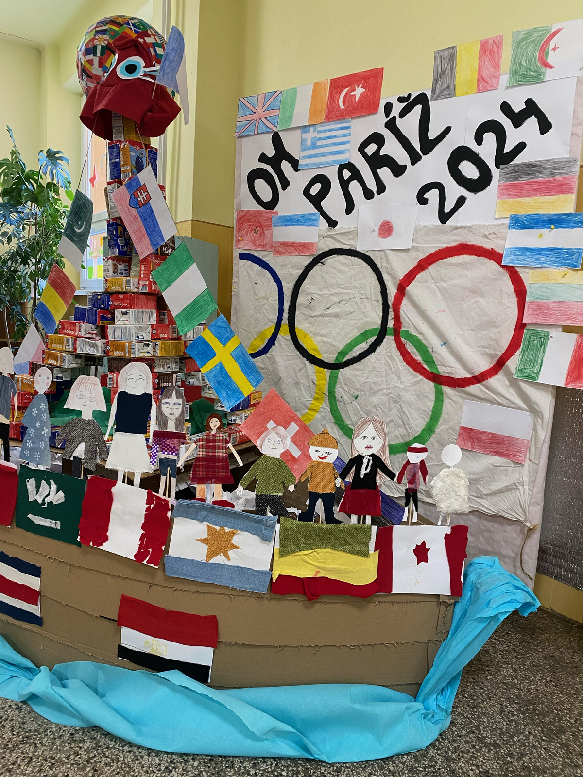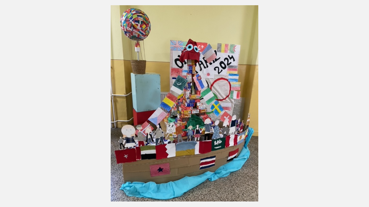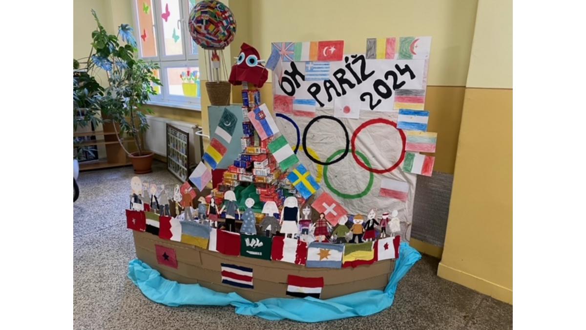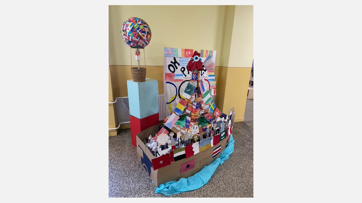 Opis diela: inšpiráciou bol plánovaný zahajovací ceremoniál v Paríži na rieke Seina. Loď z kartónu, miesto stožiara je Eiffelovka, na vrchu maskot olympijských hier, využite vlajky štátov ktoré sa zúčastnia olympiády, žiaci vytvorili zo starých látok a papiera postavičky rôznych národnosti.