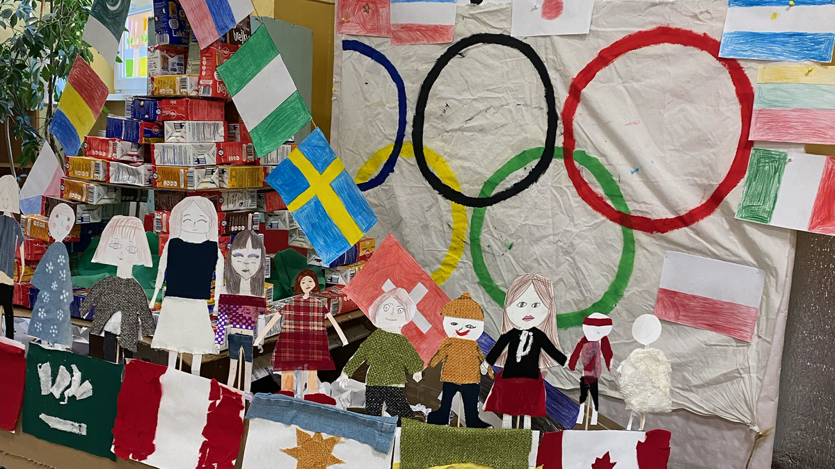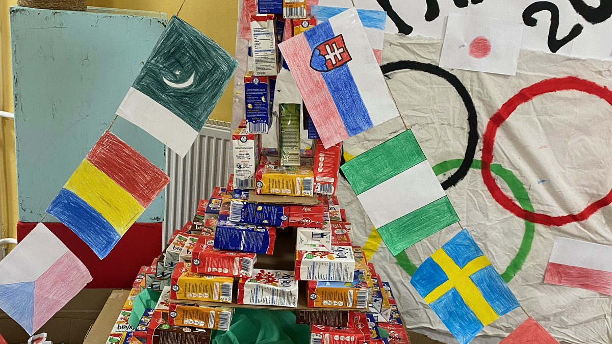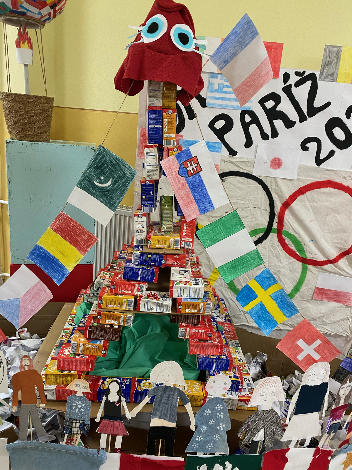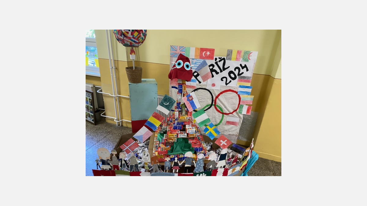 Opis diela: inšpiráciou bol plánovaný zahajovací ceremoniál v Paríži na rieke Seina. Loď z kartónu, miesto stožiara je Eiffelovka, na vrchu maskot olympijských hier, využite vlajky štátov ktoré sa zúčastnia olympiády, žiaci vytvorili zo starých látok a papiera postavičky rôznych národnosti.