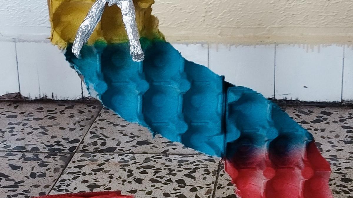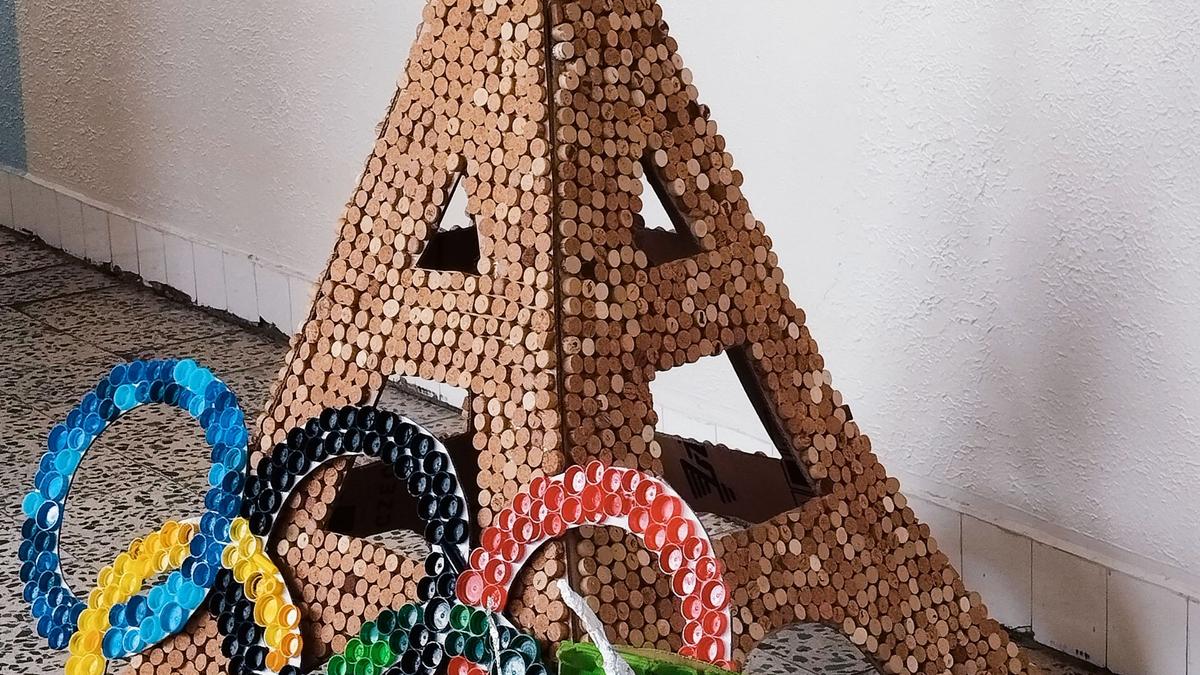 Opis diela : Zozbierané odpadové materiály sme využili na tvorbu umeleckého diela, ktoré má odkaz na Olympijské hry v Paríži a ich hodnoty.