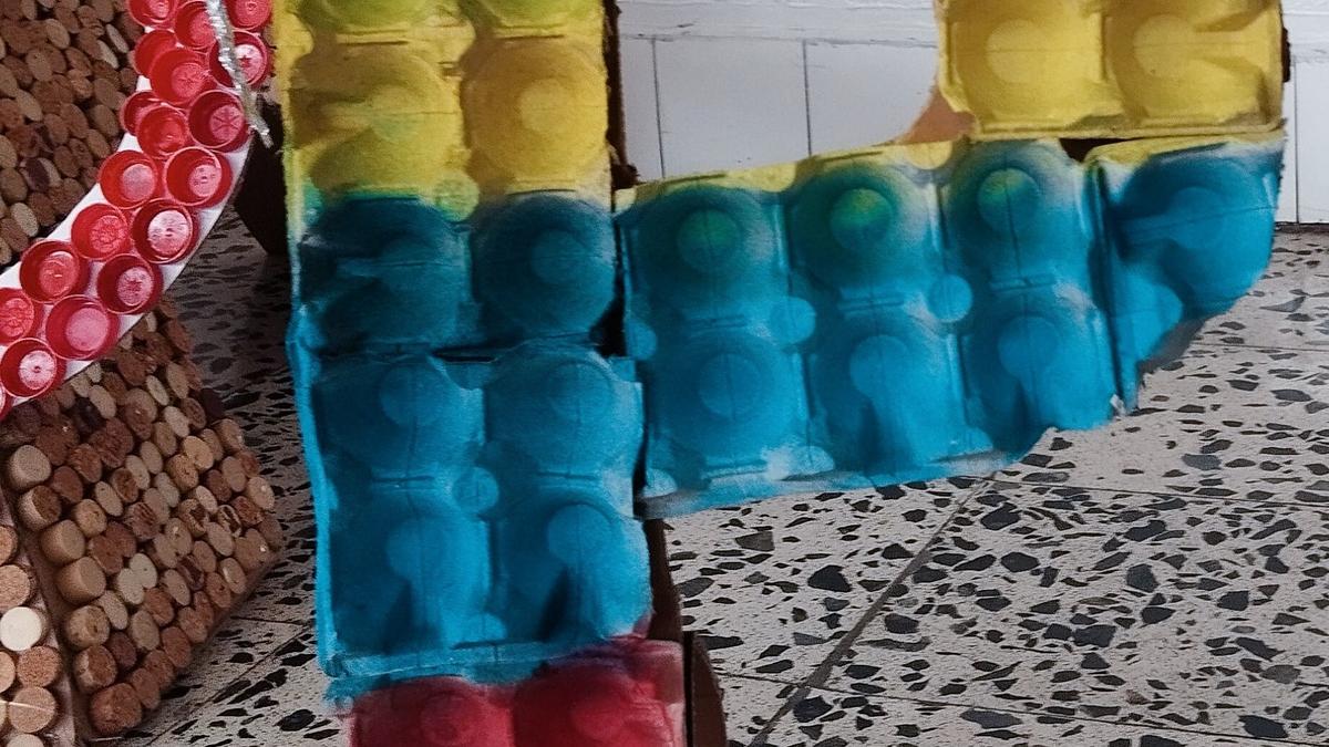 Použité materiály: Korky z vína, rôzne obaly z pochutín, vrchnáky z plastových fliaš, obaly z vajíčok, plechovky,