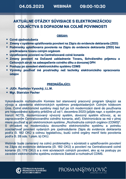 Webinár bude zameraný na colnú problematiku v súvislosti s uplatňovaním povolení na Zápis do evidencie deklaranta (čl. 182 CKÚ) a povolení na Centralizované colné konanie (čl. 179 CKÚ) a s nimi súvisiacich colných povolení, ako aj na postupy po zavedení elektronického systému evidencie žiadostí a rozhodnutí CDMS.