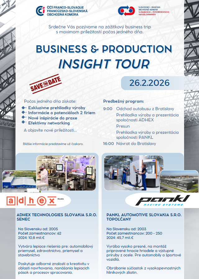 Navštívte s nami 2 zaujímavé výrobné závody, spoznajte ich špecifickú výrobu, získajte nové kontakty a objavte nové príležitosti a inšpirácie.