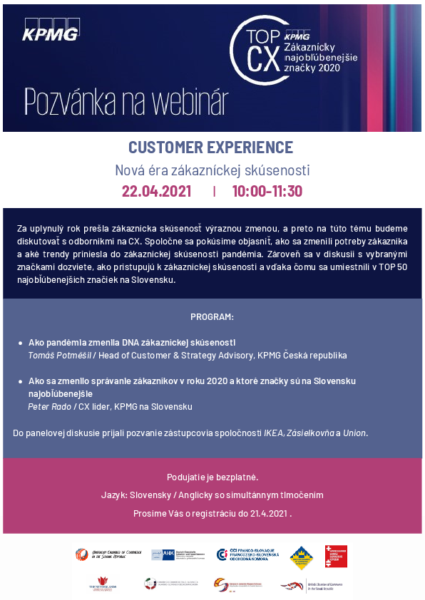 Za uplynulý rok prešla zákaznícka skúsenosť výraznou zmenou, a preto na túto tému budeme diskutovať s odborníkmi na CX. Spoločne sa pokúsime objasniť, ako sa zmenili potreby zákazníka a aké trendy priniesla do zákazníckej skúsenosti pandémia. Zároveň sa v diskusii s vybranými značkami dozviete, ako pristupujú k zákazníckej skúsenosti a vďaka čomu sa umiestnili v TOP 50 najobľúbenejších značiek na Slovensku.
