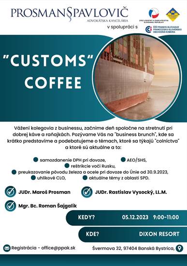 Prijmite naše pozvanie na stretnutie pri dobrej káve s raňajkami v priestoroch hotela Dixon Resort v Banskej Bystrici, dňa 05.12. 2023 od 9:00 do 11:00 hod., ktoré je organizované v spolupráci s naším členom Prosman & Pavlovič - advokátska kancelária.