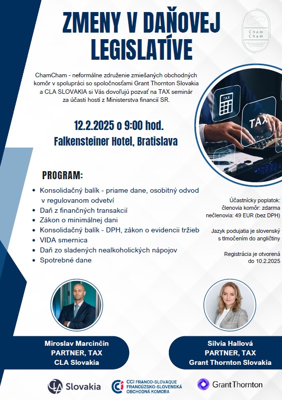 Ako člen združenia zahraničných obchodných komôr na Slovensku ChamCham si Vás dovoľujeme pozvať na Daňový seminár za účasti hostí z Ministerstva financií SR.