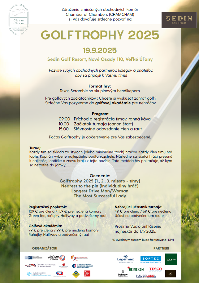 Srdečne Vás pozývame na obľúbené podujatie GOLFTROPHY 2025, ktoré sa uskutoční v piatok 19.09.2025 v golfovom rezorte SEDIN vzdialenom 40km od Bratislavy. Podujatie organizujeme v spolupráci s ďalšími zahraničnými obchodnými komorami na Slovensku (ChamCham).