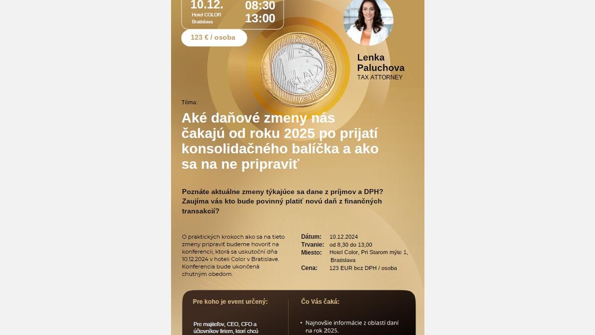 V spolupráci s naším členom PALUCHOVA TAX LAW Vás srdečne pozývame na konferenciu k tejto otázke. Dozviete sa nie len odpoveď, ale aj ďalšie dôležité informácie: