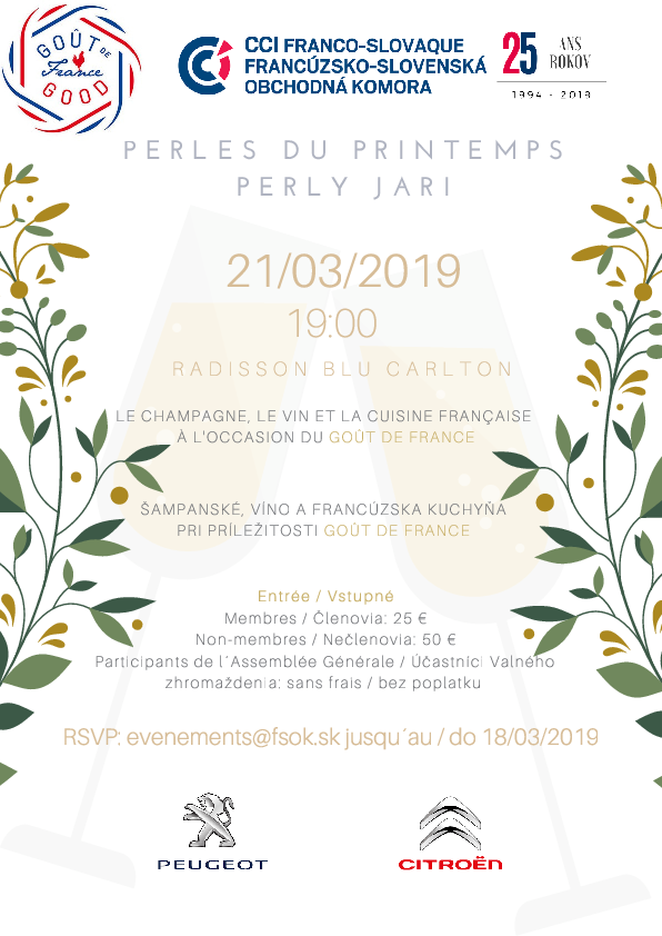 Srdečne Vás pozývame na podujatie Perly jari, ktoré bude už tradične nasledovať bezprostredne po Valnom zhromaždení dňa 21.3.2019. Príďte s nami osláviť francúzsku gastronómiu pri príležitosti 5. ročníka medzinárodného podujatia Goût de France a ochutnajte vynikajúcu francúzsku kuchyňu, vína či šampanské v uvoľnenej atmosfére spoločnosti členov a priateľov FSOK.